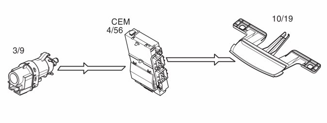 This function is controlled by the left control stalk. The steering wheel module (SWM) (3/130) sends signals to the central electronic module (CEM) (4/56) via LIN communication to activate the turn signals (10/13-14 and 10/47-54).