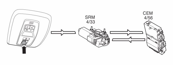 The central electronic module (CEM) (4/56) sends information on vehicle speed to the front sun roof module (SRM). This information is used when calculating how much force is required from the motors to operate the roof hatch.