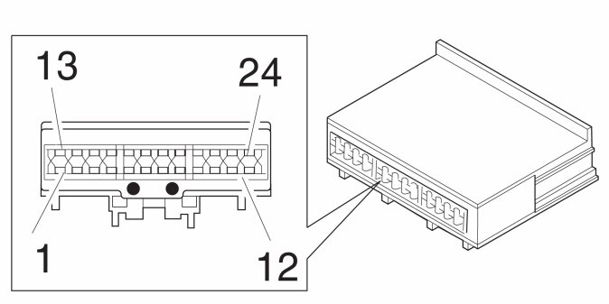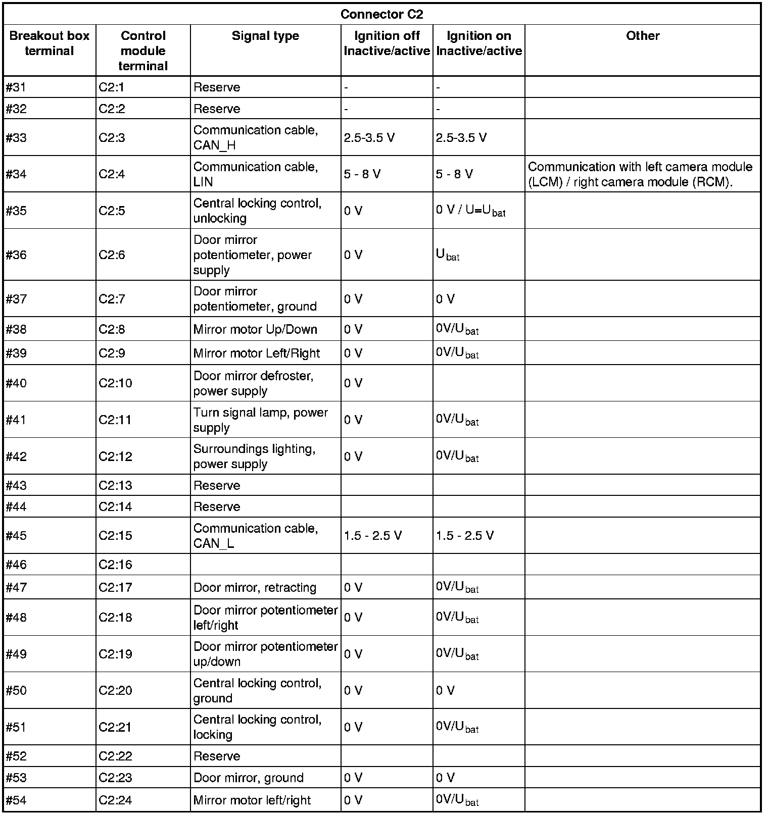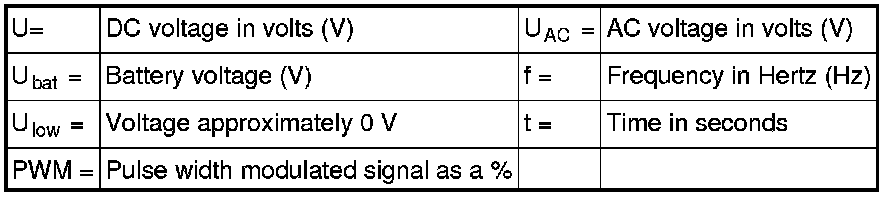 All the values given below are between the respective terminal in column 1 and terminal #C1:13 in column 2 (power ground) unless otherwise stated in brackets after the table entry.
