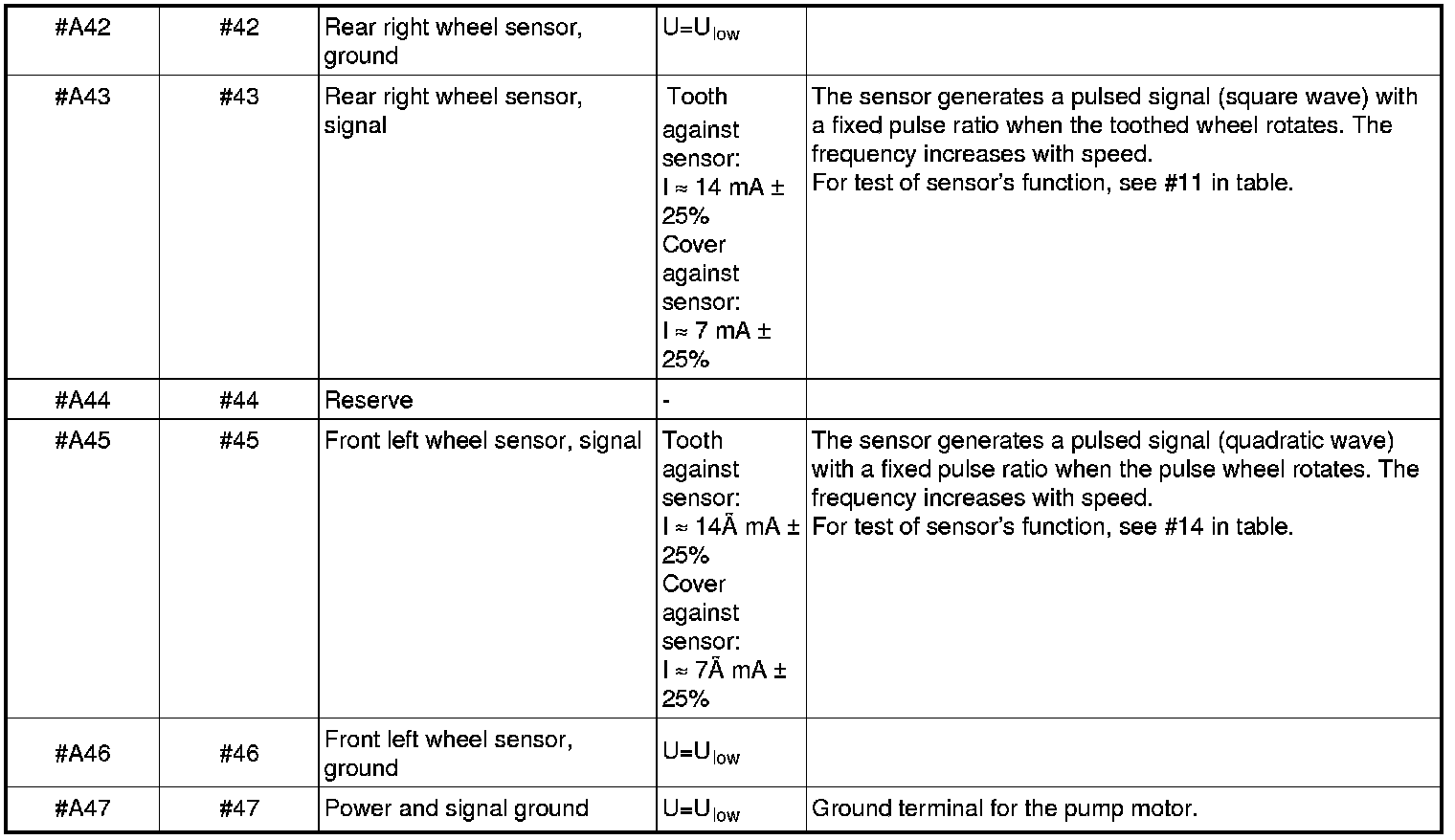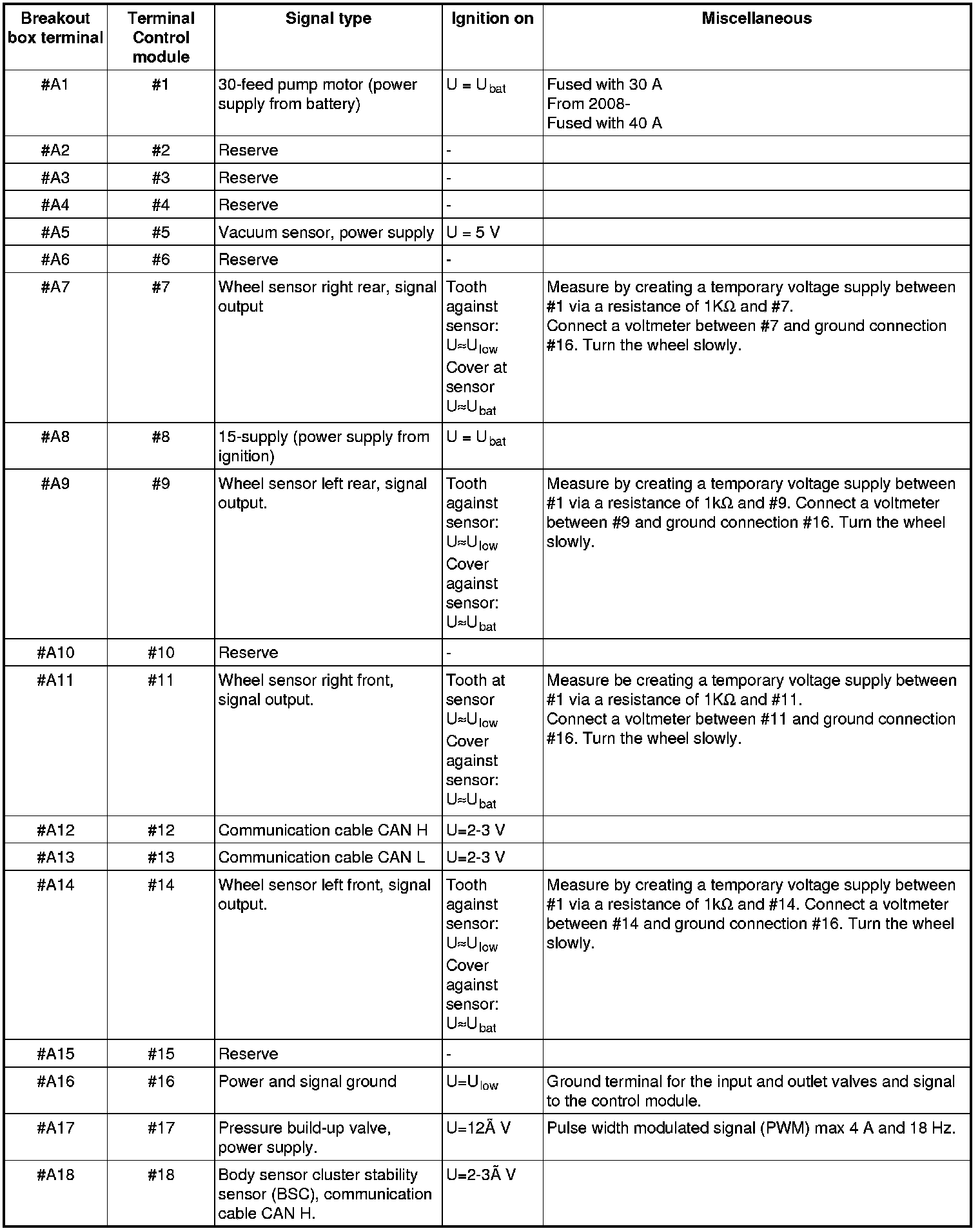 All the values given below are between the relevant terminal stated in column 1 and terminal #A16 or #A47 (ground) unless otherwise stated in parenthesis after the table entry.