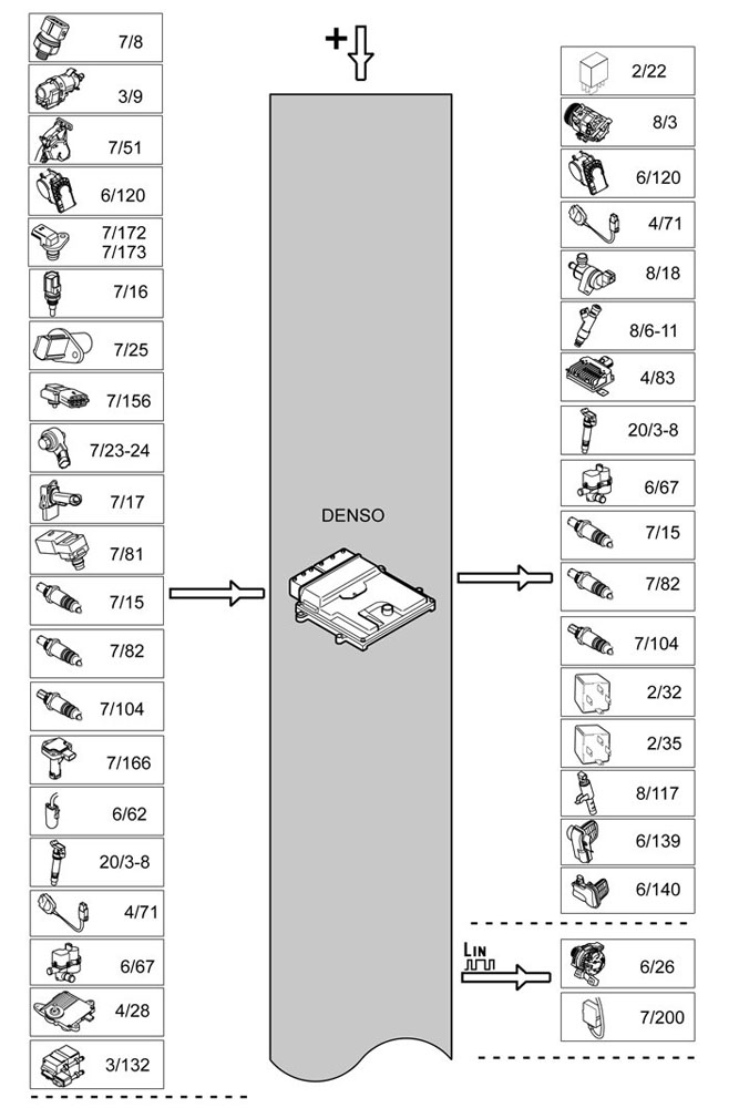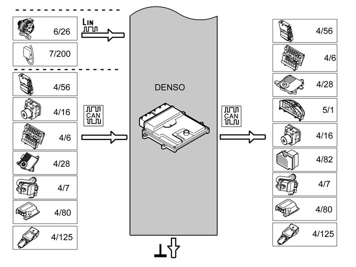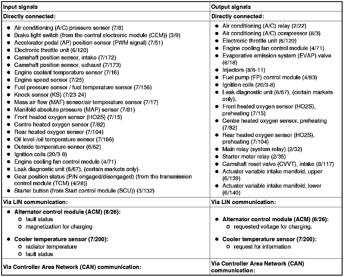 The table below summarizes the input signals to and output signals from the Engine Control Module (ECM). The signal types are divided into directly connected signals, LIN and CAN communication. The illustration below gives the same information as the Volvo component designations.