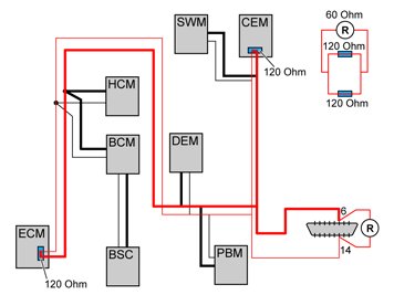 - For the HS CAN (High Speed) the terminating resistor is in the Central electronic module (CEM) and the engine control module (ECM).
