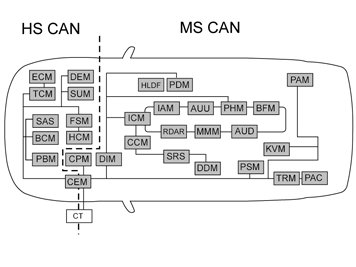 The network consists of two parts: a high speed side (HS CAN) which transmits signals/messages between the central electronic module (CEM) and control modules mainly in the engine compartment. A middle-speed side (MS CAN) which transmits signals/messages between the central electronic module (CEM) and control modules in the passenger compartment and the luggage compartment.