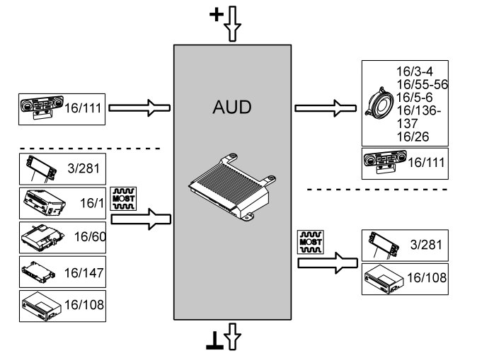 The audio module (AUD) communicates with directly connected components and with other control modules and components via the MOST network, a fiber optic network used for communication.