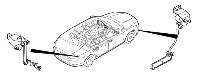 One position sensor is located next to the rear axle and is connected to the left-hand rear control arm by a linkage system. The other position sensor is next to the right-hand front axle and is connected to the right-hand front control arm by a linkage system. This linkage system affects the sensor, allowing the angle of the car to be gauged.