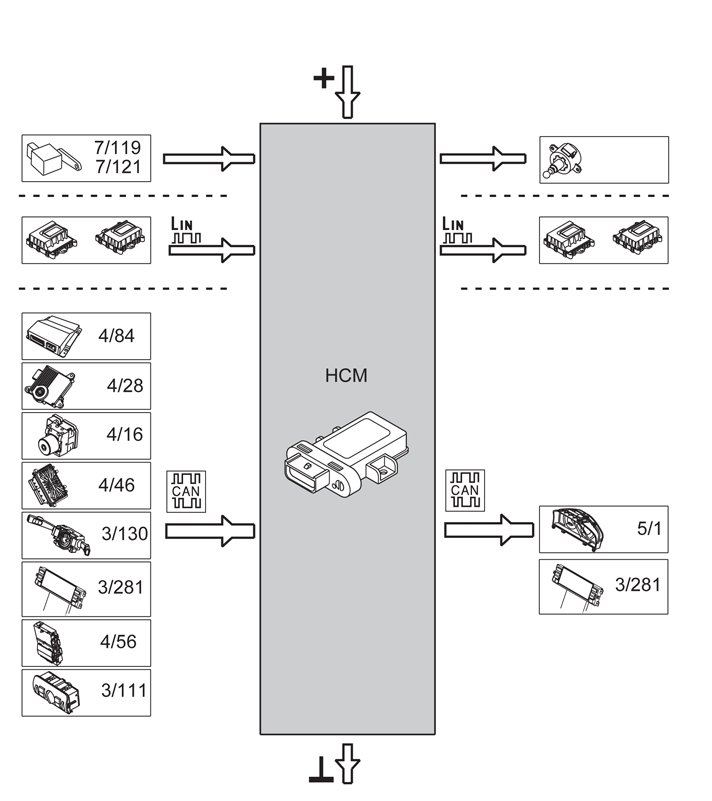 The table below summarizes the input signals to and output signals from the headlamp control module (HCM). The signal types are divided into directly connected signals, serial communication and CAN communication. The illustration below displays the same information with the Volvo component designations.