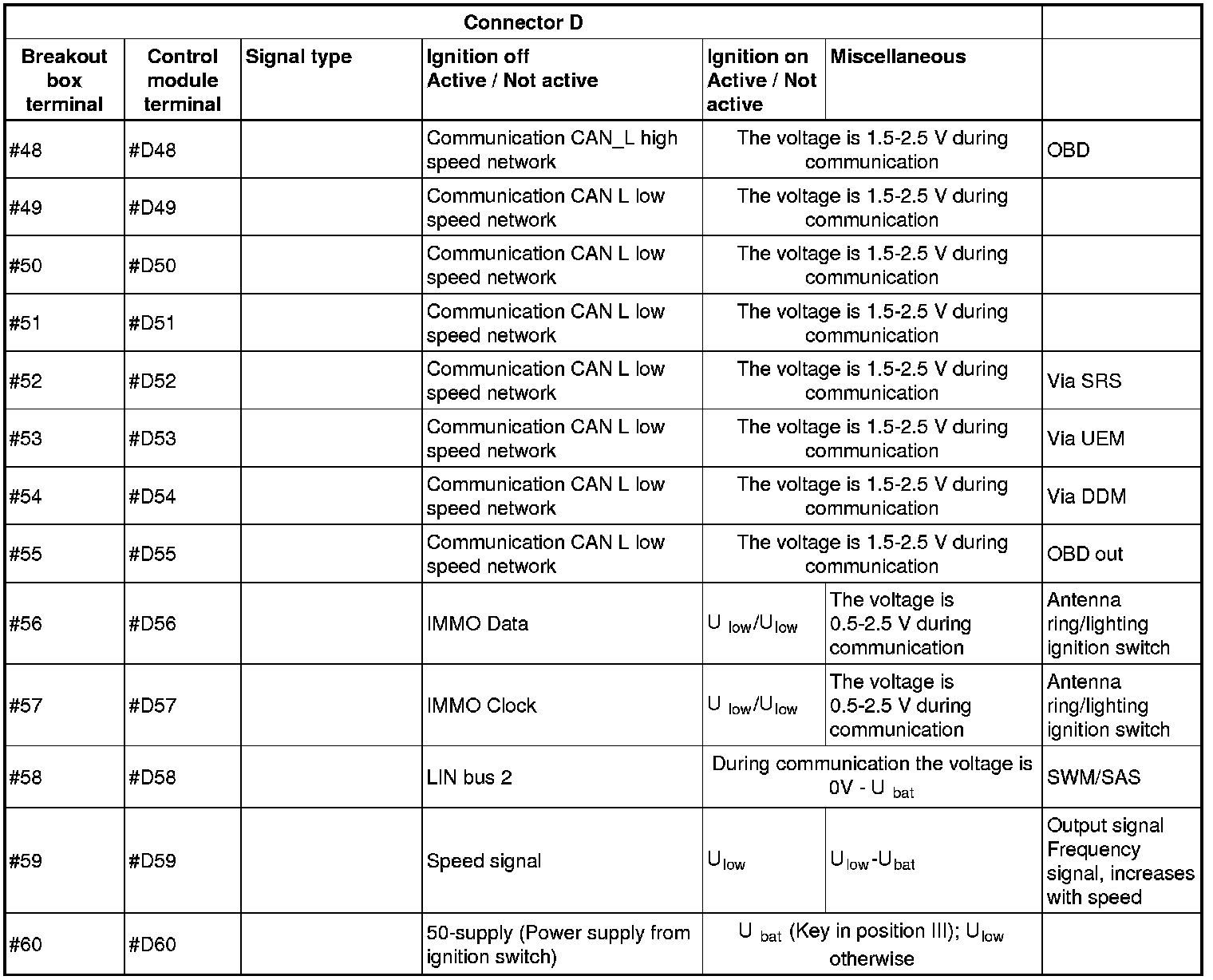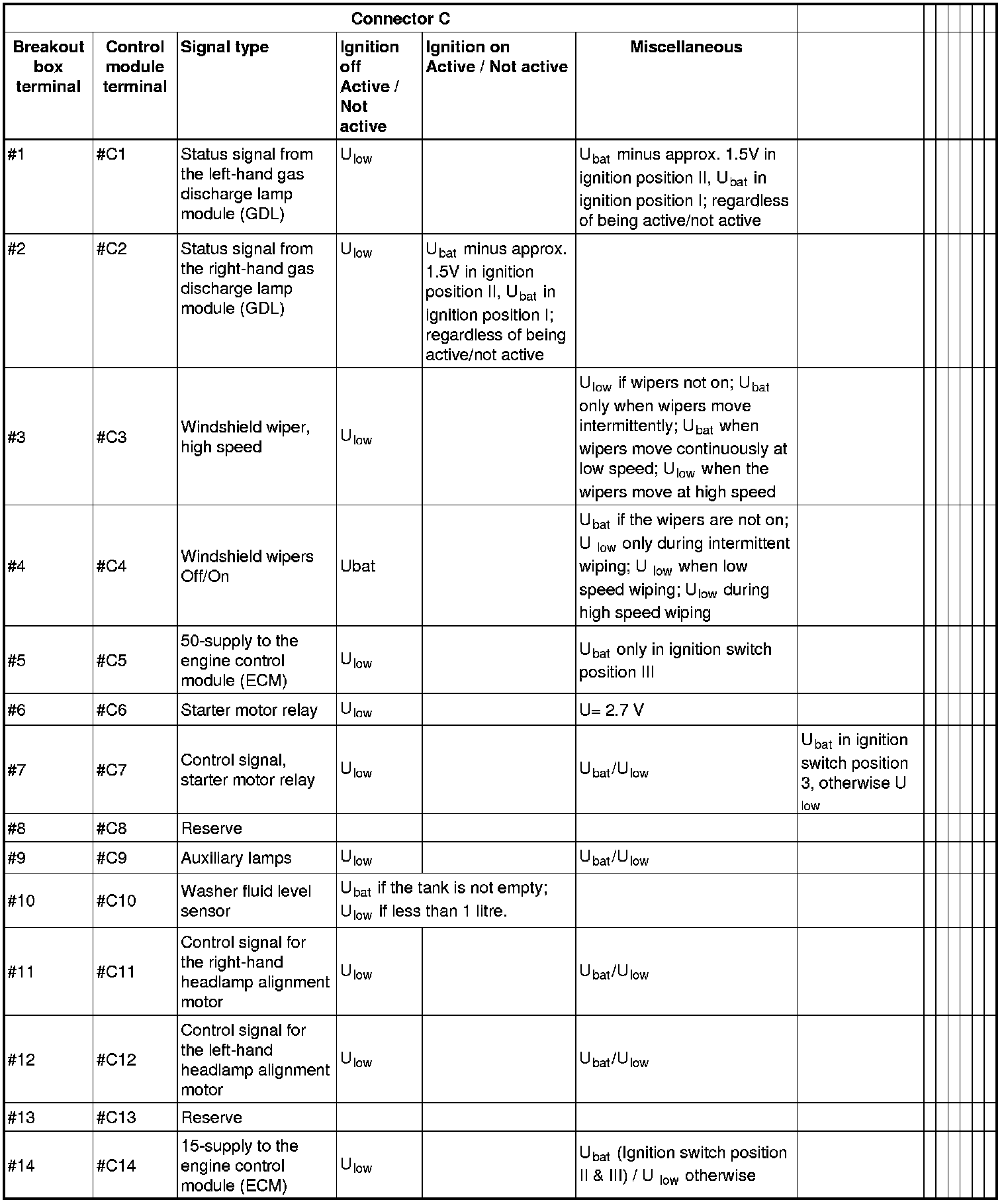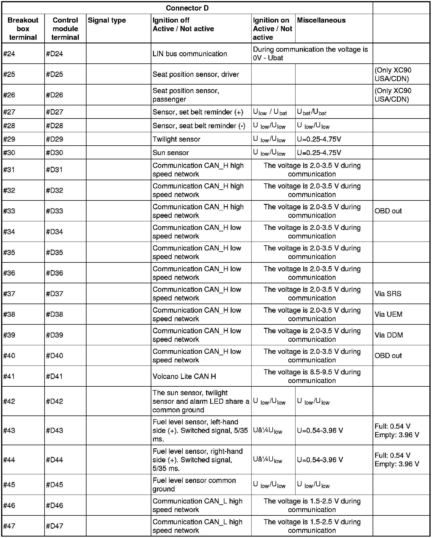 All the values given below are between the terminals stated in column 1 and terminal #D6 in column 2 (power ground). This applies unless otherwise indicated in the last column.
