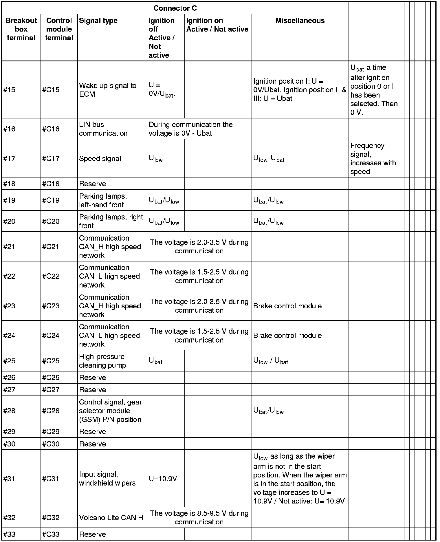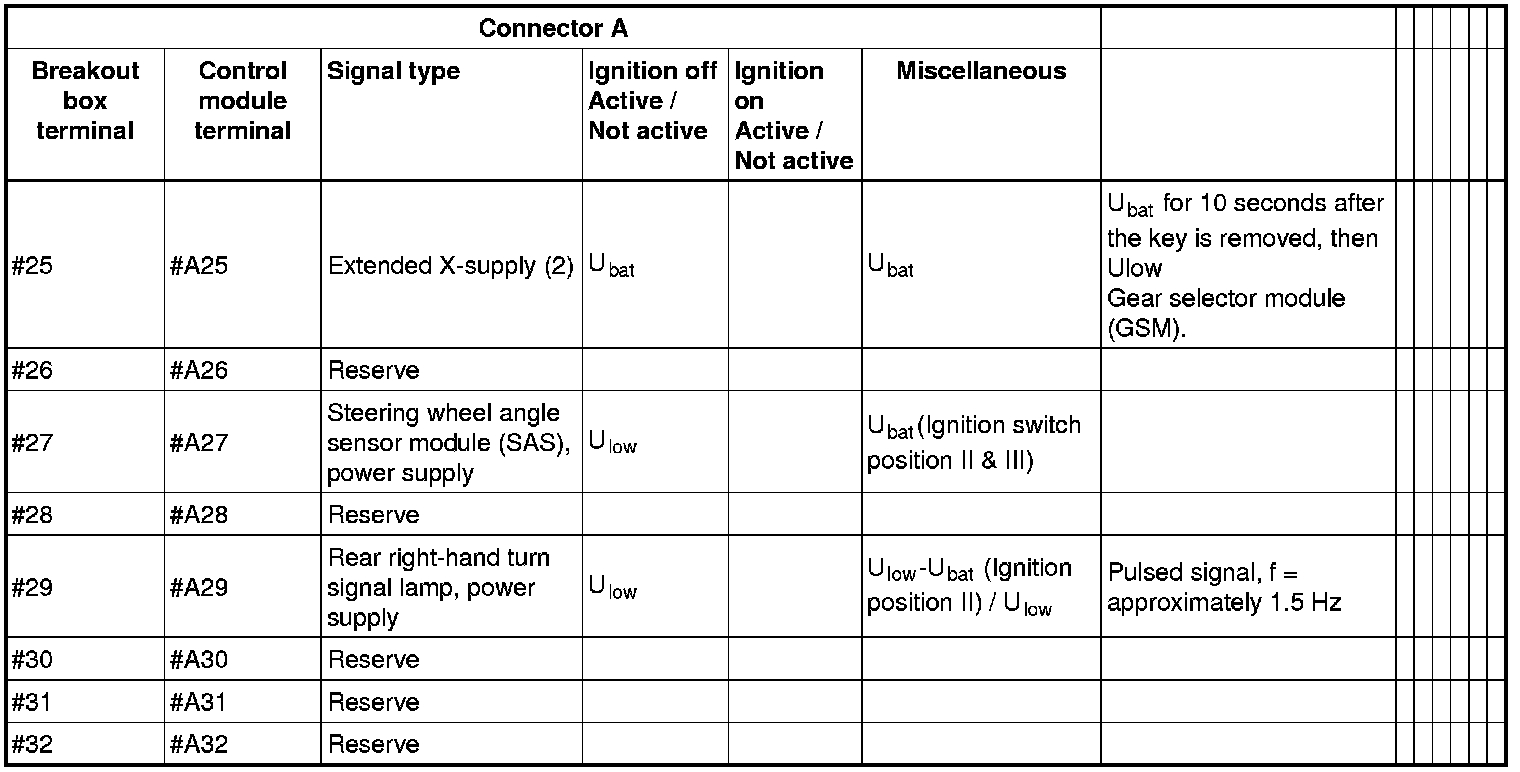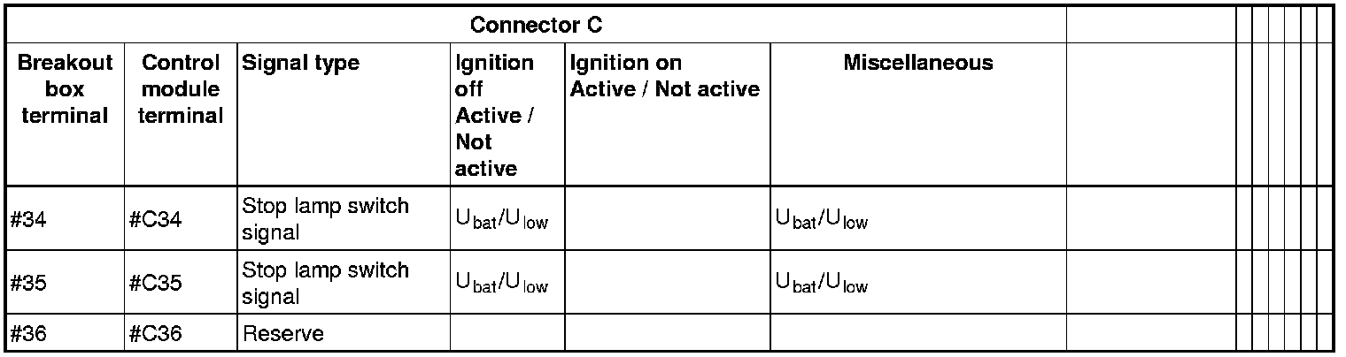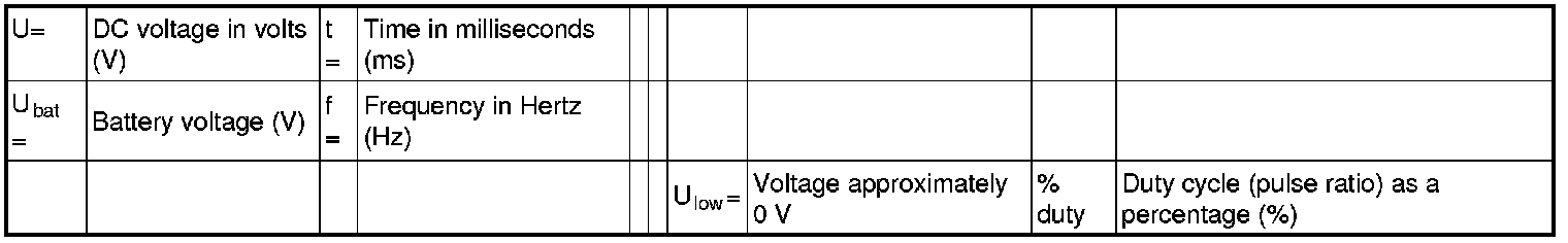 All the values given below are between the terminals stated in column 1 and terminal #D6 in column 2 (power ground). This applies unless otherwise indicated in the last column.