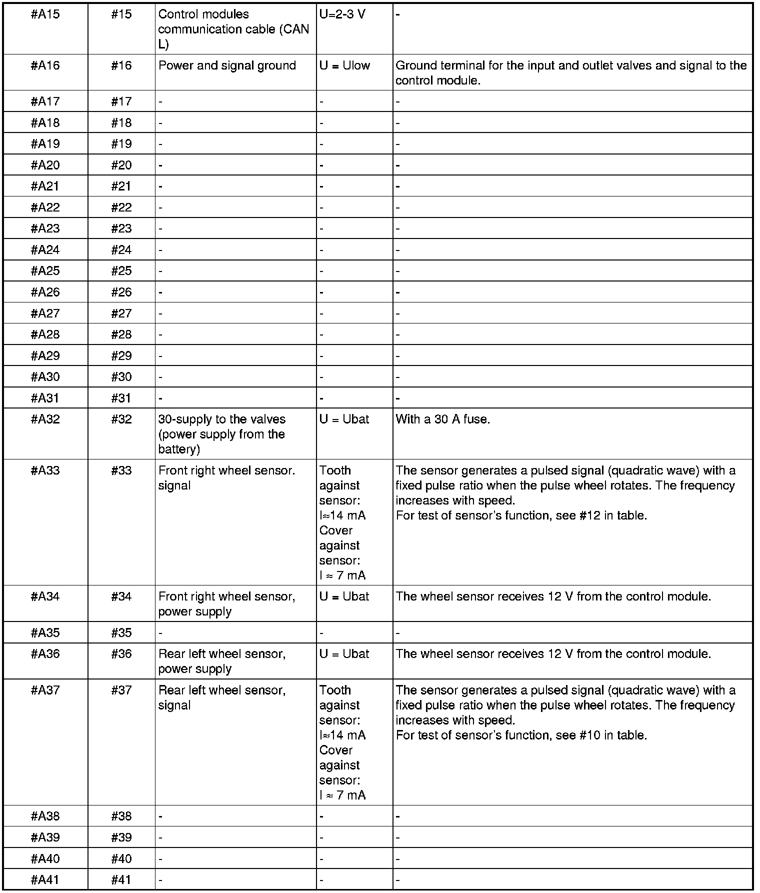 All values given are between the relevant terminal in column 1 and terminal #A16 or #A47 (ground), unless otherwise indicated in brackets.