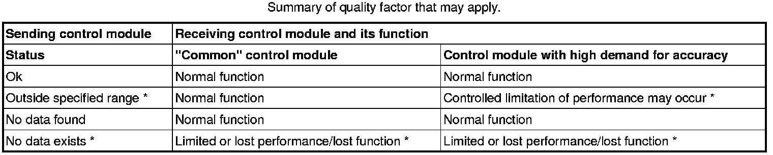 In a distributed system where information (signals) is sent between different control modules in a network, it is usually the control module that generates/creates information (the signal) that knows the quality of the information that is sent. To be able to inform receiving control modules about the quality of information, a quality factor (Q-factor) is sent over the network at the same time as the information (signal). The quality factor describes status of the information (signal). For example, if the signal is defective due to a faulty sensor, a receiving control module can use the quality factor to decide if the control module shall take any action (e.g., reconfiguration).