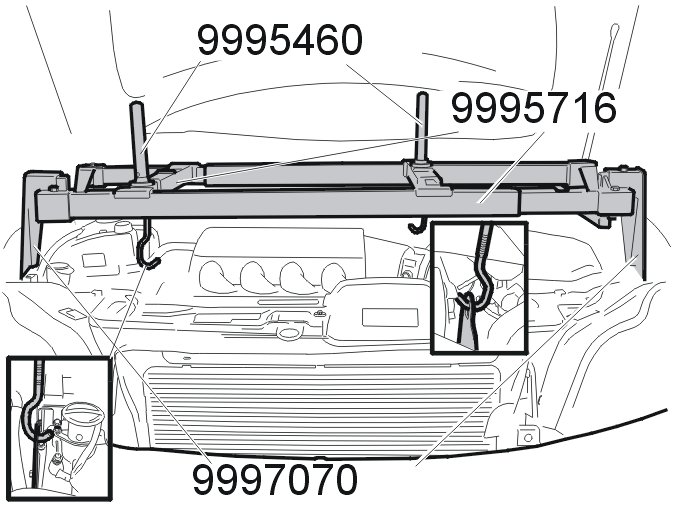 - the lifting tool: 999 5716 Reading off tool 999 5716 Reading Off Tool converted with kit 999 7070 Mounting 999 7070 Mounting and the lifting hooks: 999 5460 Lifting hook 999 5460 Lifting Hook. Lift up the engine slightly so that the engine pads are unloaded.