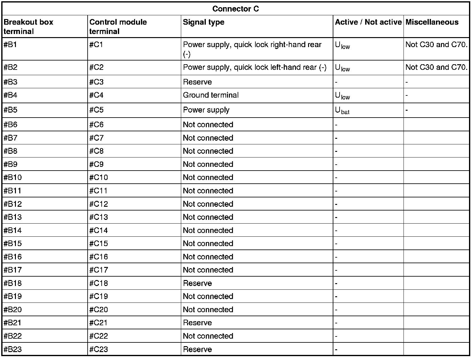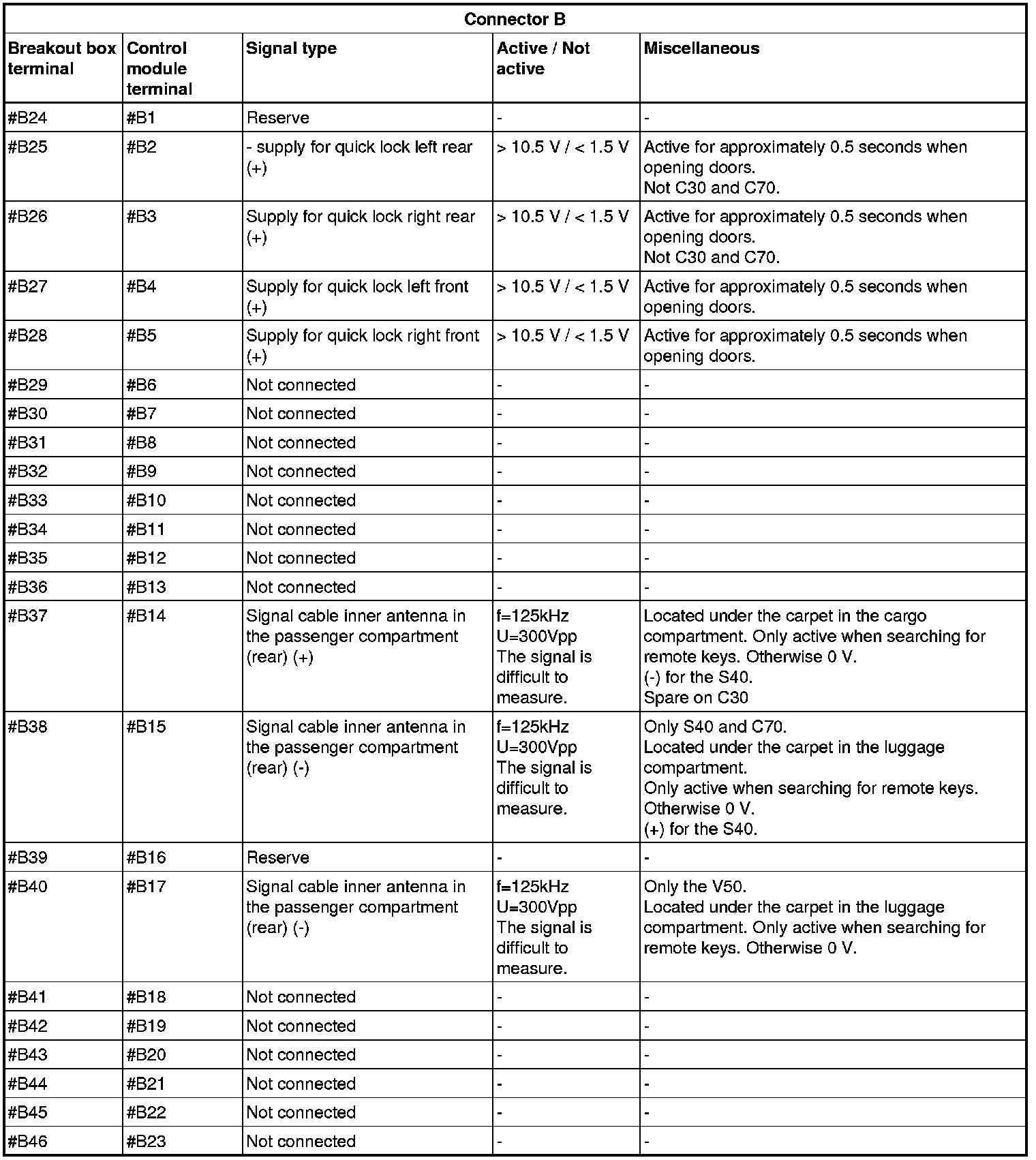 All values given below are between the terminals stated in column 1 and terminal #B4 (power ground). This applies unless otherwise indicated in brackets.