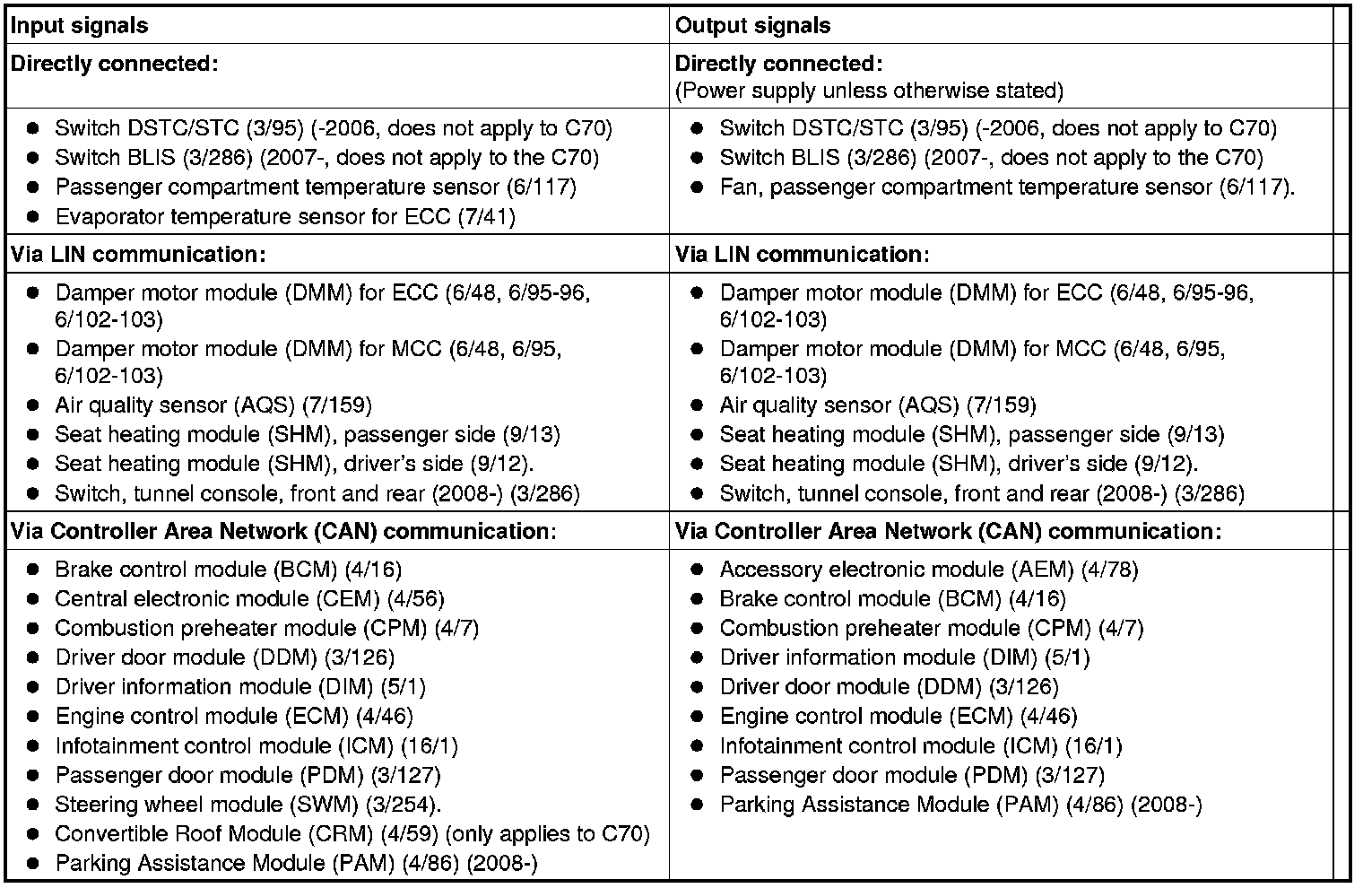 The table below summarizes the input signals to and output signals from the climate control module (CCM). The signal types are divided into directly connected signals, LIN and CAN communication. The illustration below displays the same information with the Volvo component designations.