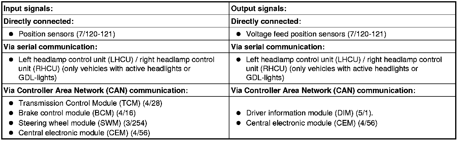 The table below summarizes the input signals to and output signals from the headlamp control module (HCM). The signal types are divided into directly connected signals, serial communication and CAN communication. The illustration below displays the same information with the Volvo component designations.