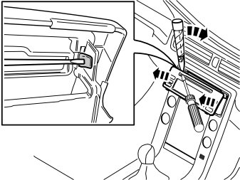 - Press in the catch at one of the panel's upper corners. Use a small screwdriver. Carefully pry off the radio panel on the same side. Use a plastic weatherstrip tool.