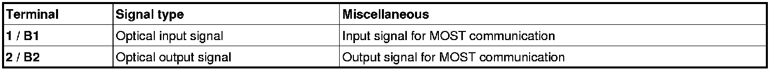 The two optical terminals in the connector are numbered in the same way on all control modules in the MOST network. There are two sizes of switch that the two optical terminals are mounted in. One with a connector with integrated power supply is integrated with the optical terminals and the other has a connector with only the optical terminals.