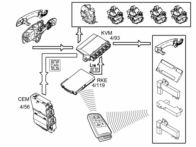 When the contact breaker in the handle is closed, the keyless vehicle module (KVM) activates the antennas in the handle on the rear doors on the side on which the handle was pulled out. A request is transmitted via the antenna to the passive remote key. The remote key transmits an encrypted response which is received by the remote keyless entry (TRX) receiver. The remote keyless entry (TRX) receiver checks that the received signal is from a Volvo remote key. If it is, the message is forwarded to the keyless vehicle module (KVM). The keyless vehicle module (KVM) decrypts the signal and compares the received code from the remote key with its own programmed codes. If these correspond, the keyless vehicle module (KVM) transmits two signals. One signal is transmitted to the quick lock, in the door on which the handle was pulled out, to unlock and open the door. The other signal is transmitted to the central electronic module (CEM) which unlocks the other doors, depending on the system settings. The settings are: