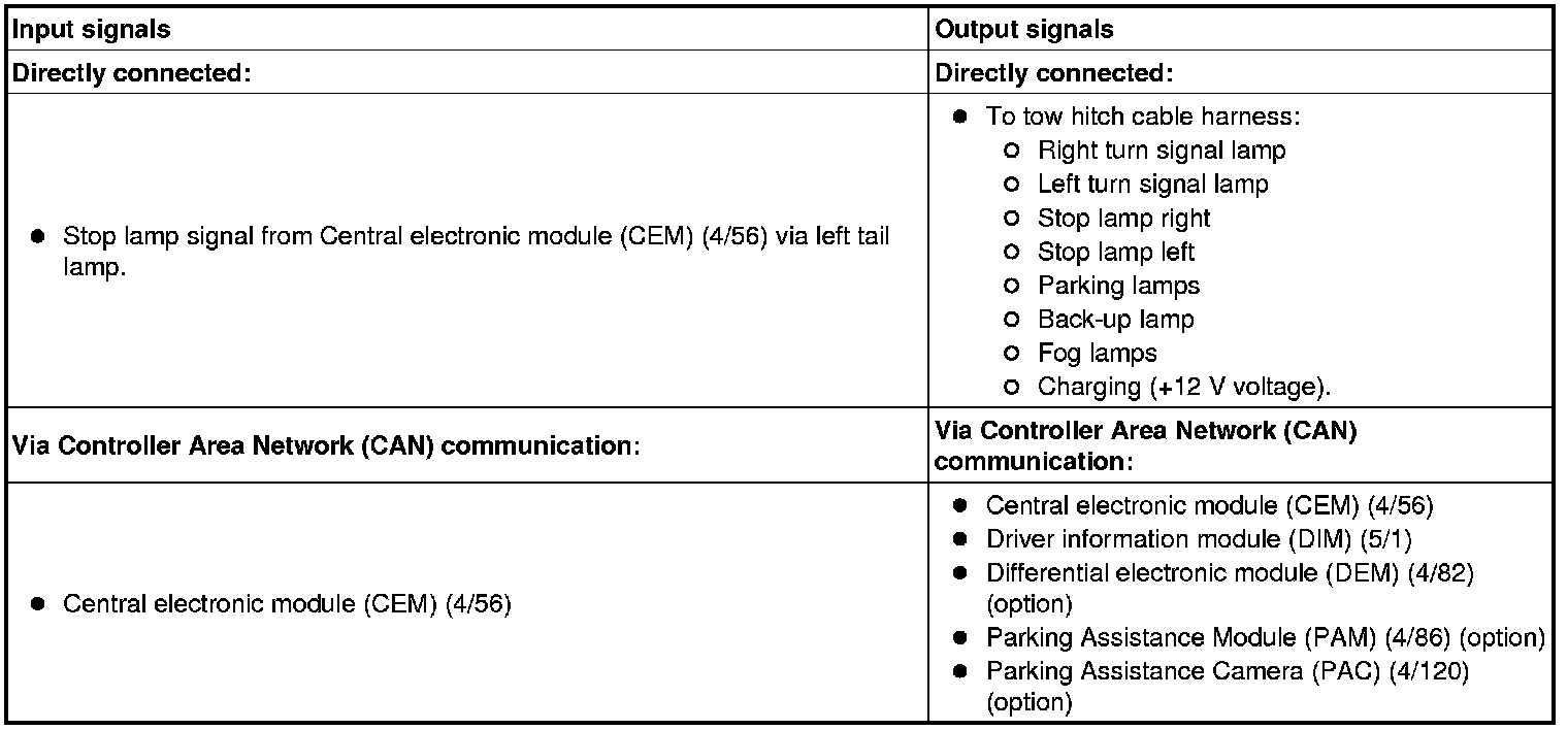 The table below summarizes the input signals to and output signals from the trailer module (TRM). The signal types are divided into directly connected signals and CAN communication. The illustration below displays the same information with the Volvo component designations.