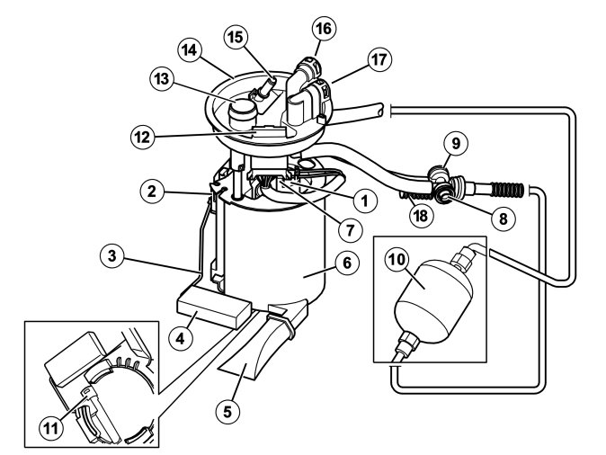 The pump electronic module (PEM) is supplied with battery voltage by the fuel pump (FP) relay and is grounded in the car body. The fuel pump (FP) relay is controlled by the central electronic module (CEM) when requested by the engine control module (ECM).