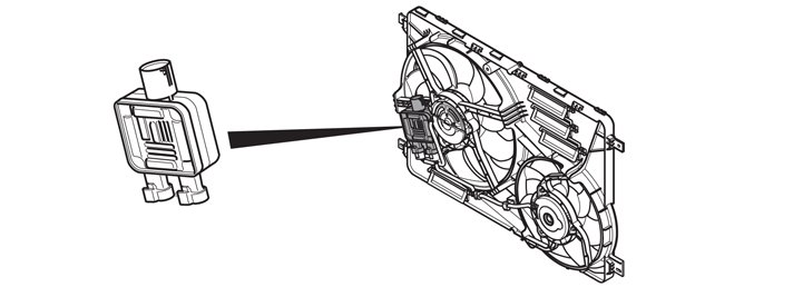 The engine cooling fan (FC) consists of two fans and two control modules. The control modules are controlled by the same signal from the engine control module (ECM).