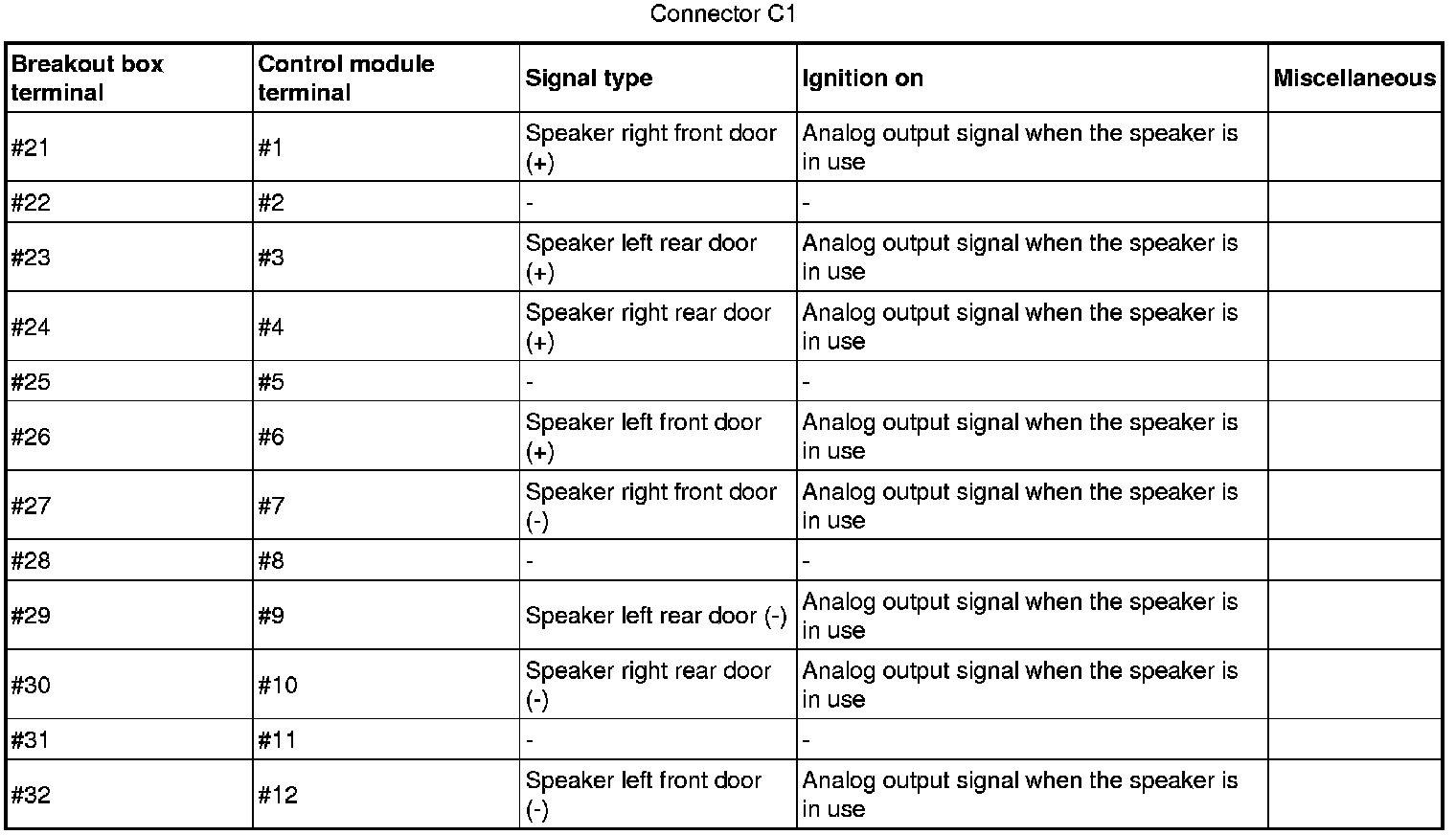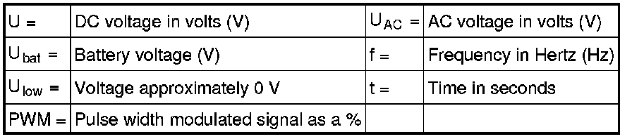 All values below are measured between the relevant terminal in column 1 and C2-8 in column 2 (power ground) unless otherwise stated in parenthesis after the table entry.