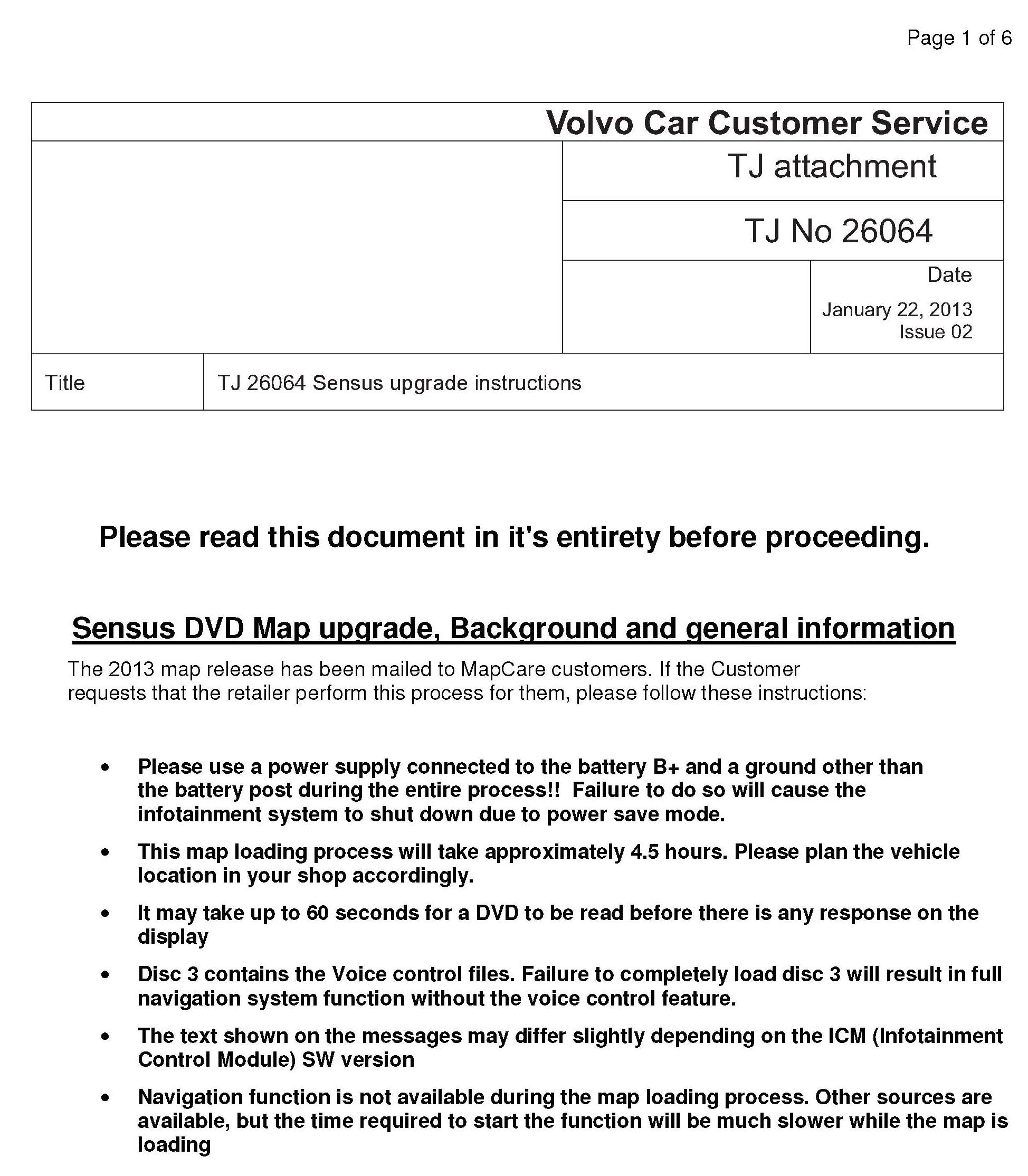 Before performing one of these upgrades, ensure that the customer has provided the correct disc for the vehicle. The current Sensus map set part number is 31358443
