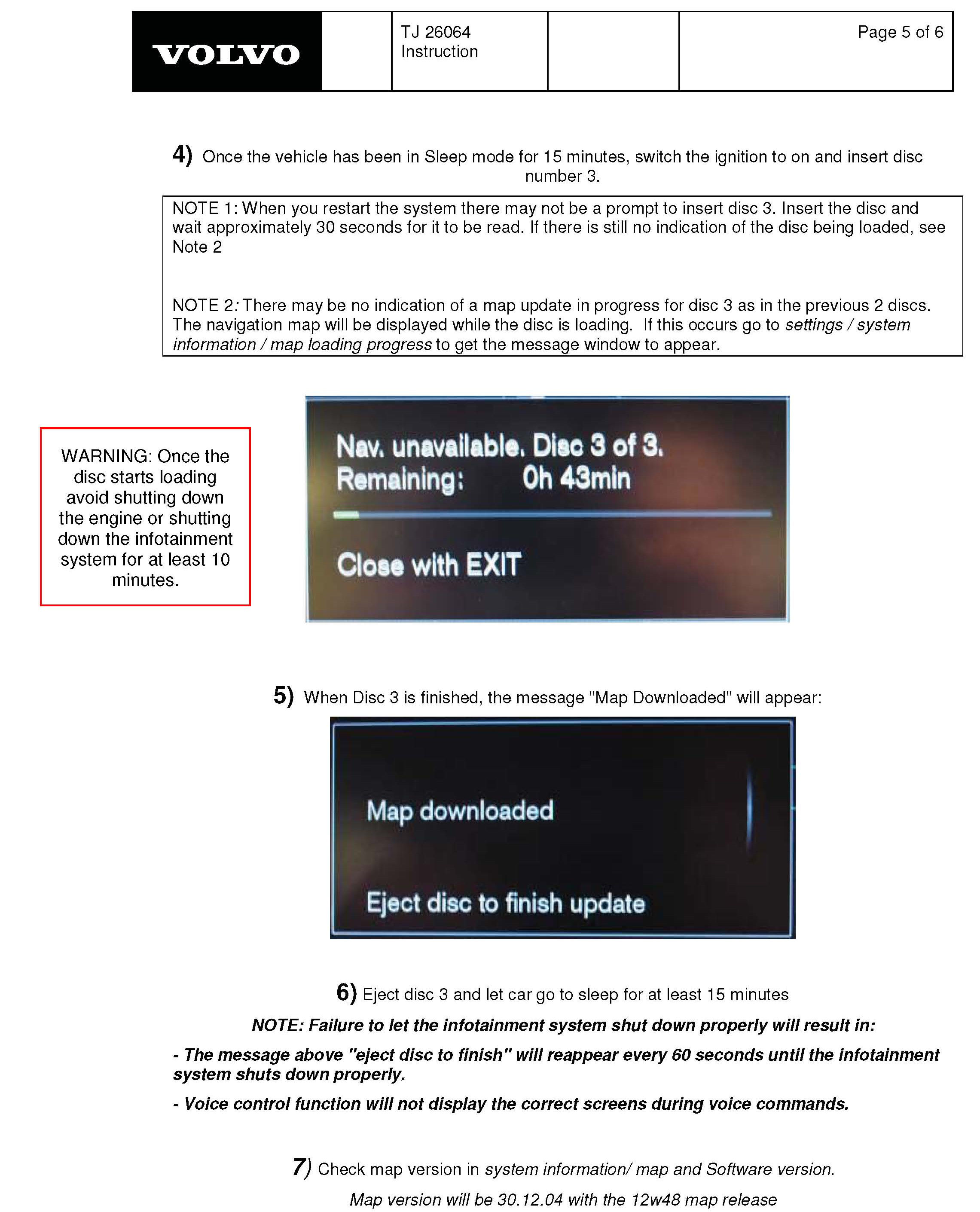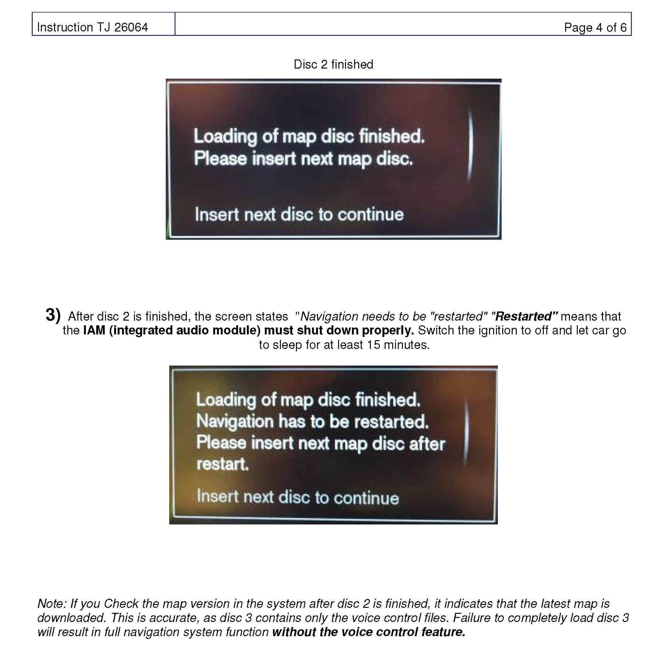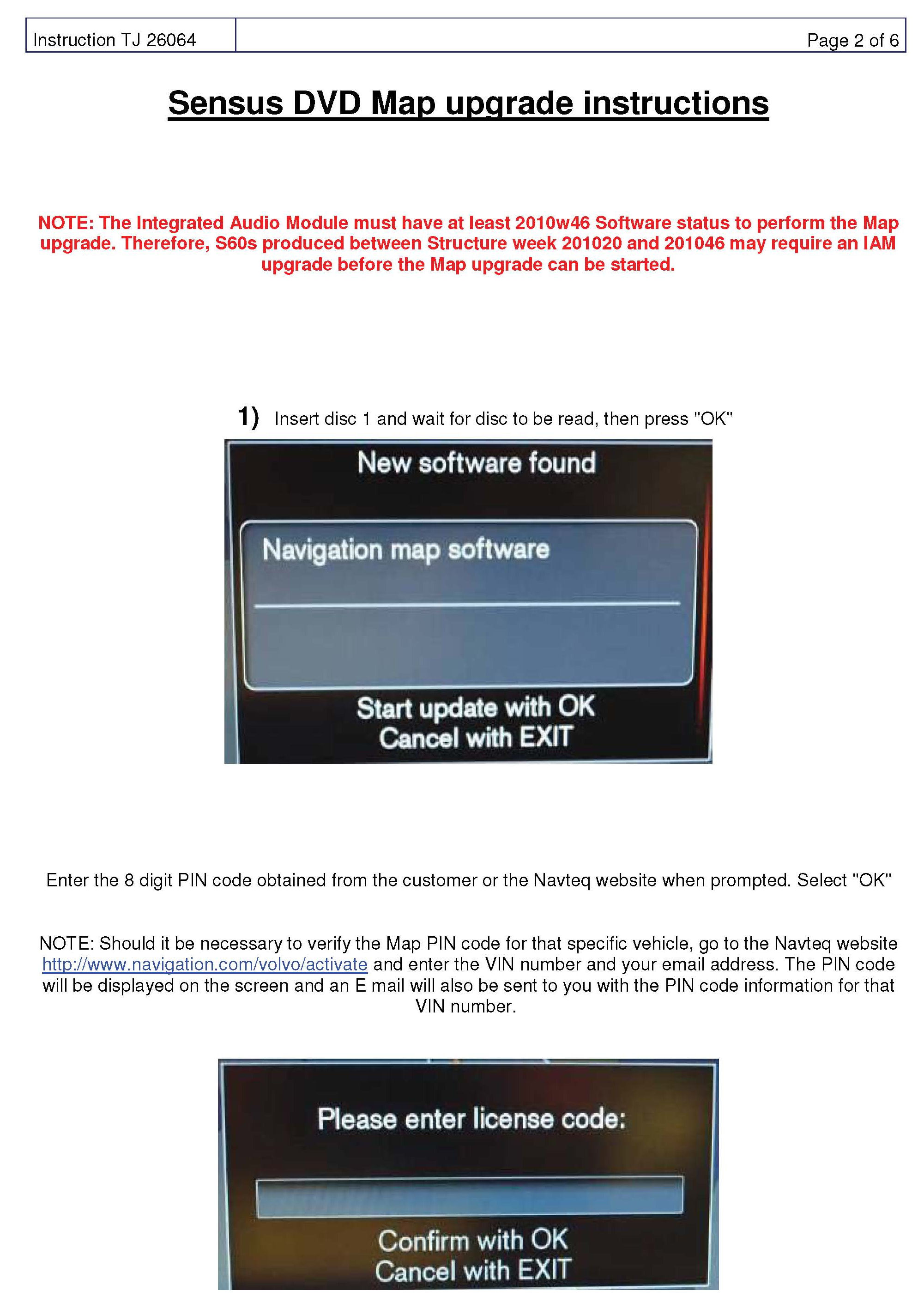 The IAM must have at least 2010w46 IAM SW status to perform the Map upgrade. Therefore, S60s produced between Structure week 201020 and 201046 may require an IAM upgrade before the Map upgrade can be started. Customers owning these vehicles have been notified of this in a communication from Navteq along with the map delivery.