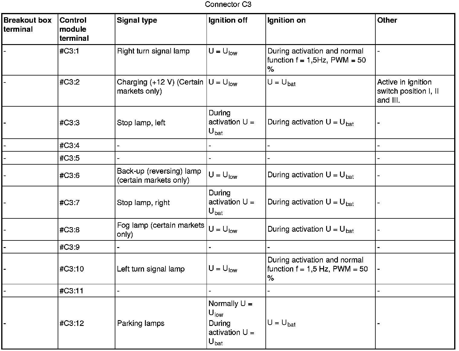 All the values given below are between the terminals stated in column 1 and terminal #C2:4 in column 2 (power ground).