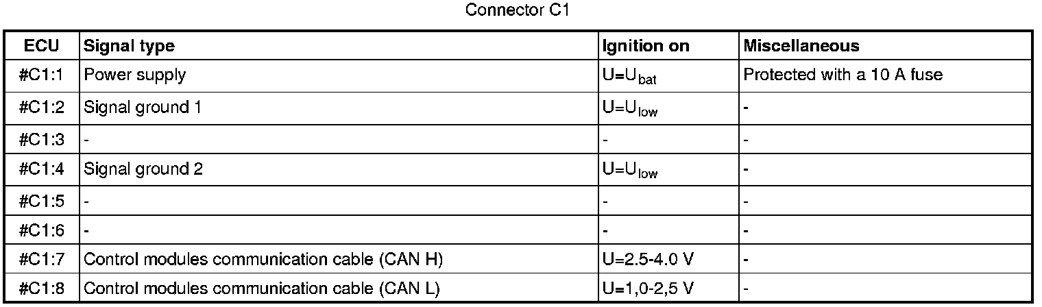 All the values that are given are measured between the respective connection given in column 1 and #2 or #4 (ground).