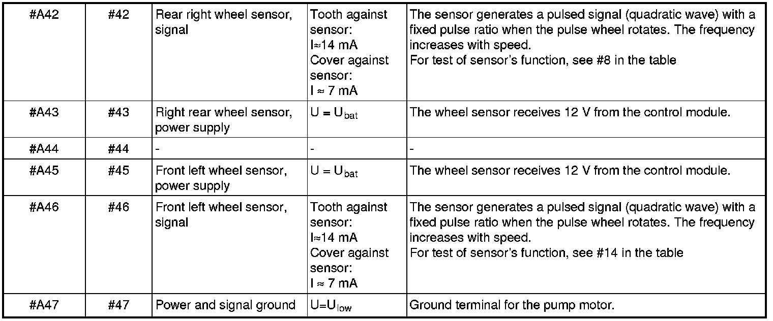 All values given are between the relevant terminal in column 1 and terminal #A16 or #A47 (ground), unless otherwise indicated in brackets.