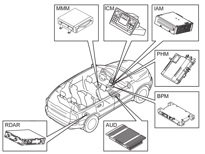 The infotainment control module (ICM) deals with monitoring and communication on the MOST network. The infotainment control module (ICM) is in turn monitored by the central electronic module (CEM) on the CAN network.