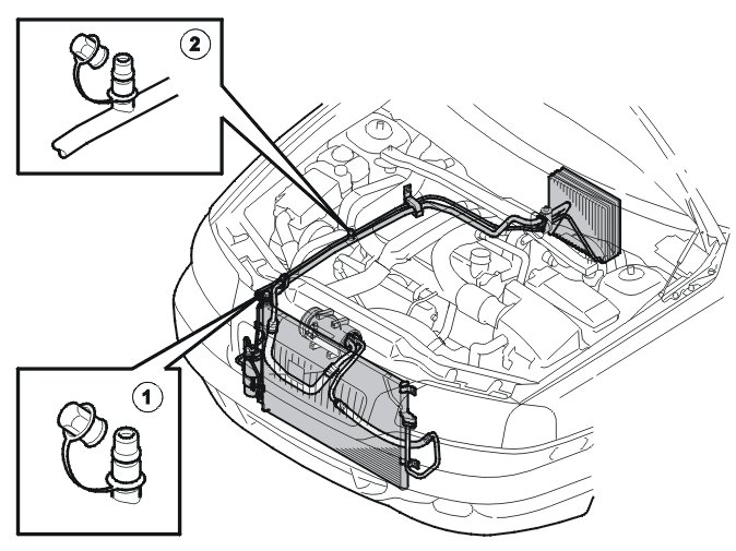 Caution! Filling with refrigerant must only be carried out on the high-pressure side to prevent the risk of liquid refrigerant in the compressor.