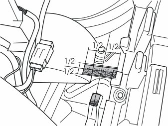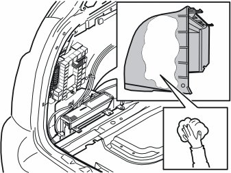 - Clean the marked surfaces on the embossing on the rear edge of the left-hand rear wheel housing under the fuse holder with a mixture of 20 % isopropyl alcohol (P/N 1161721) and 80 % water.