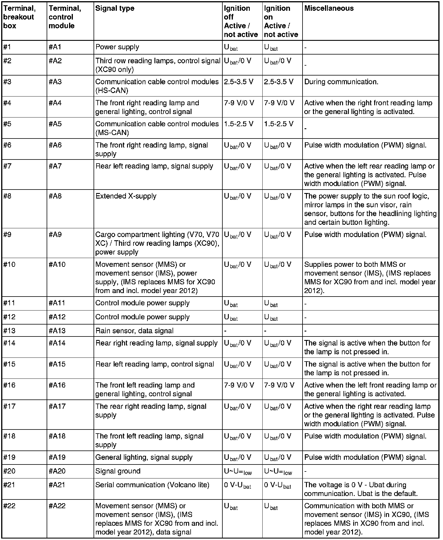 The following values are measured between the relevant terminal in column 1 and terminal #A20 (signal ground) unless otherwise stated.