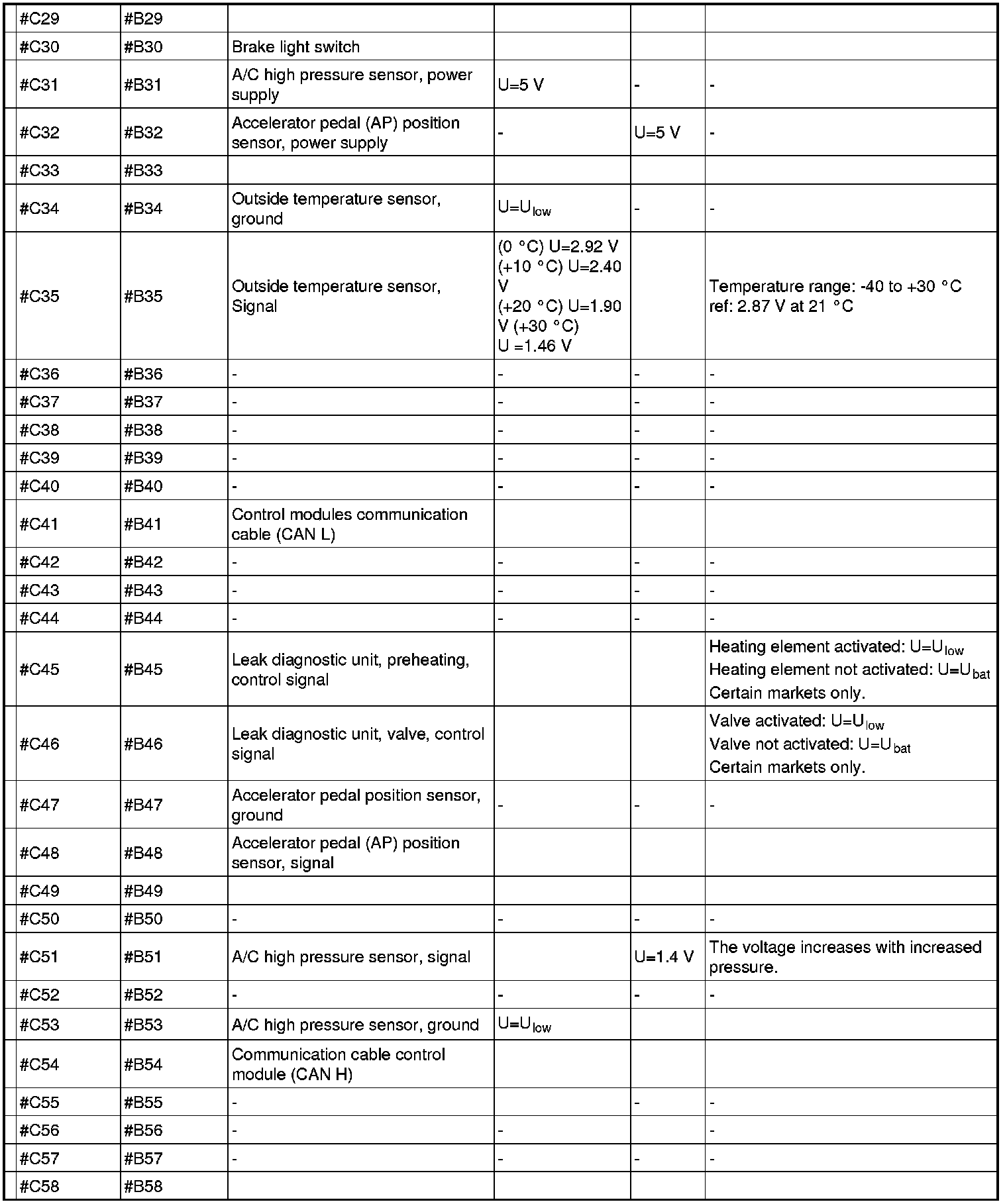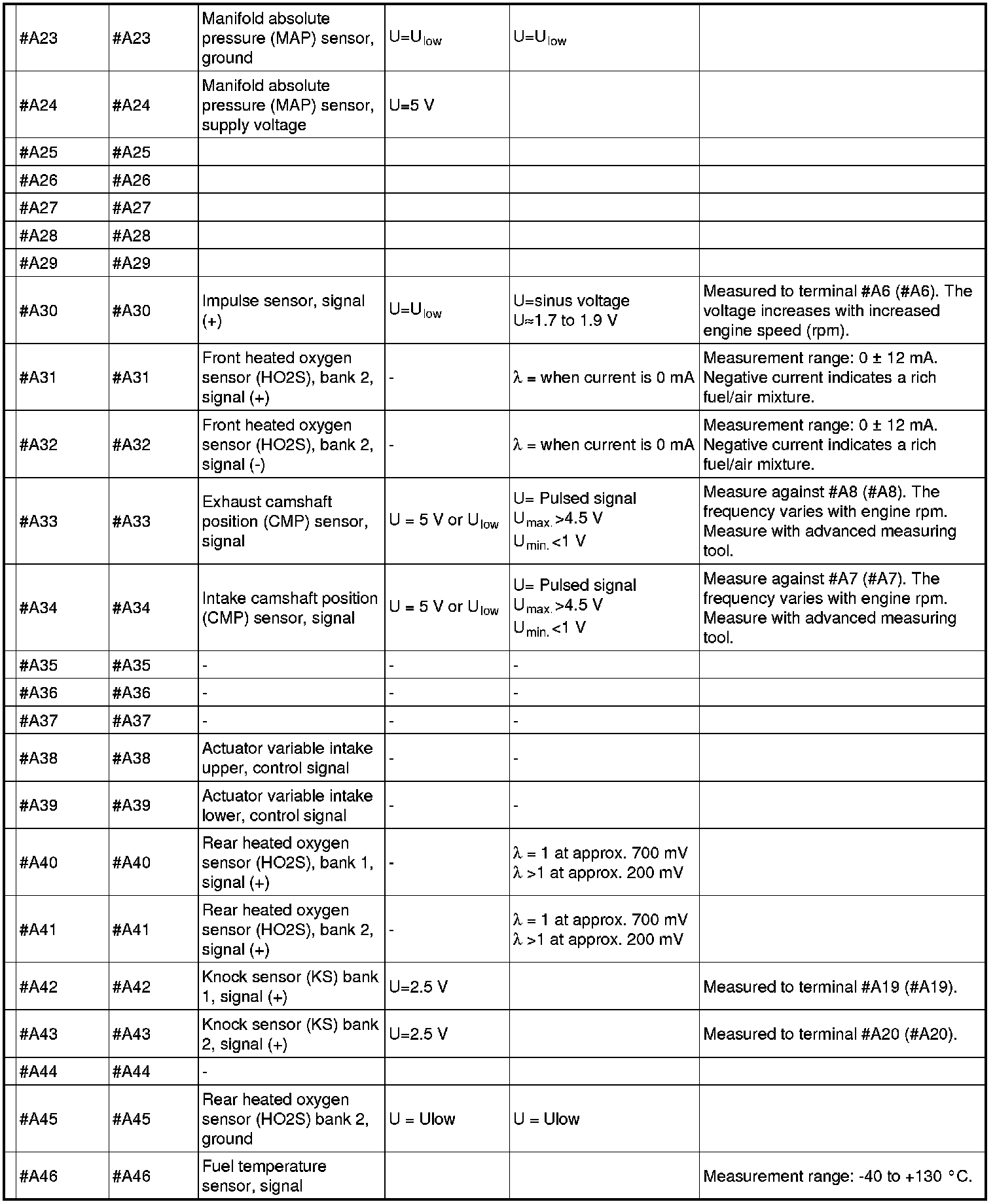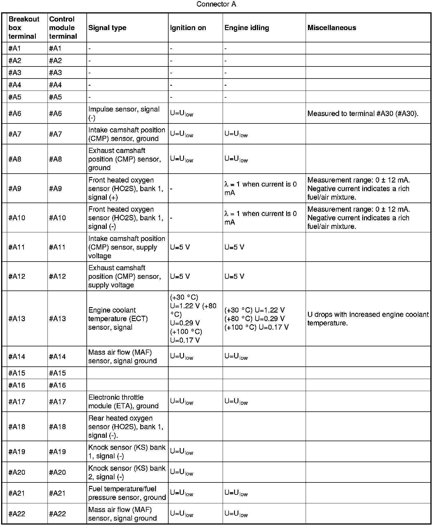 All values indicated below are between respective connection in column 1 and #A C2 on the breakout box. If this is not the case, it is indicated within brackets.
