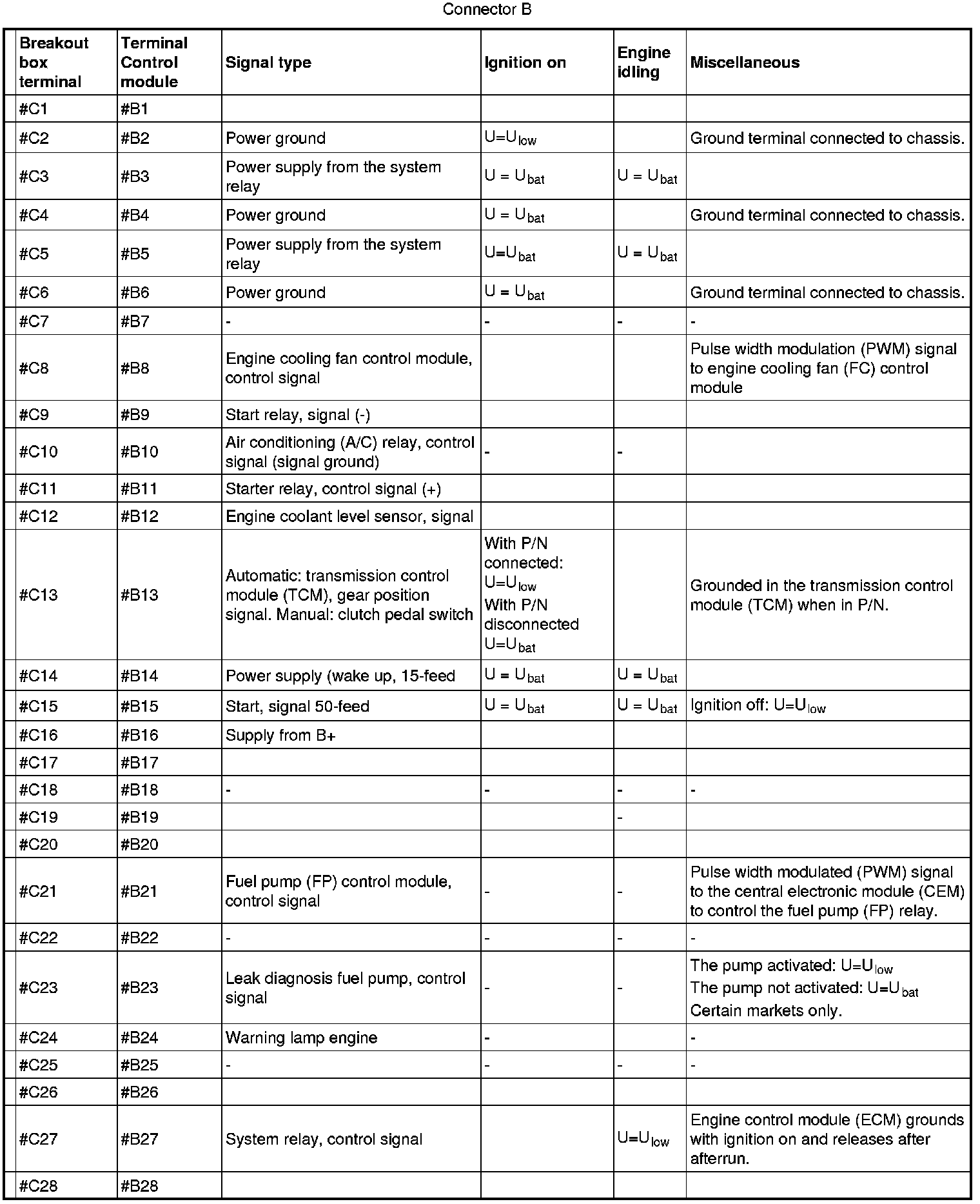 Connector B (58-pin engine side) corresponds to terminals #C1 - #58 on the breakout box.