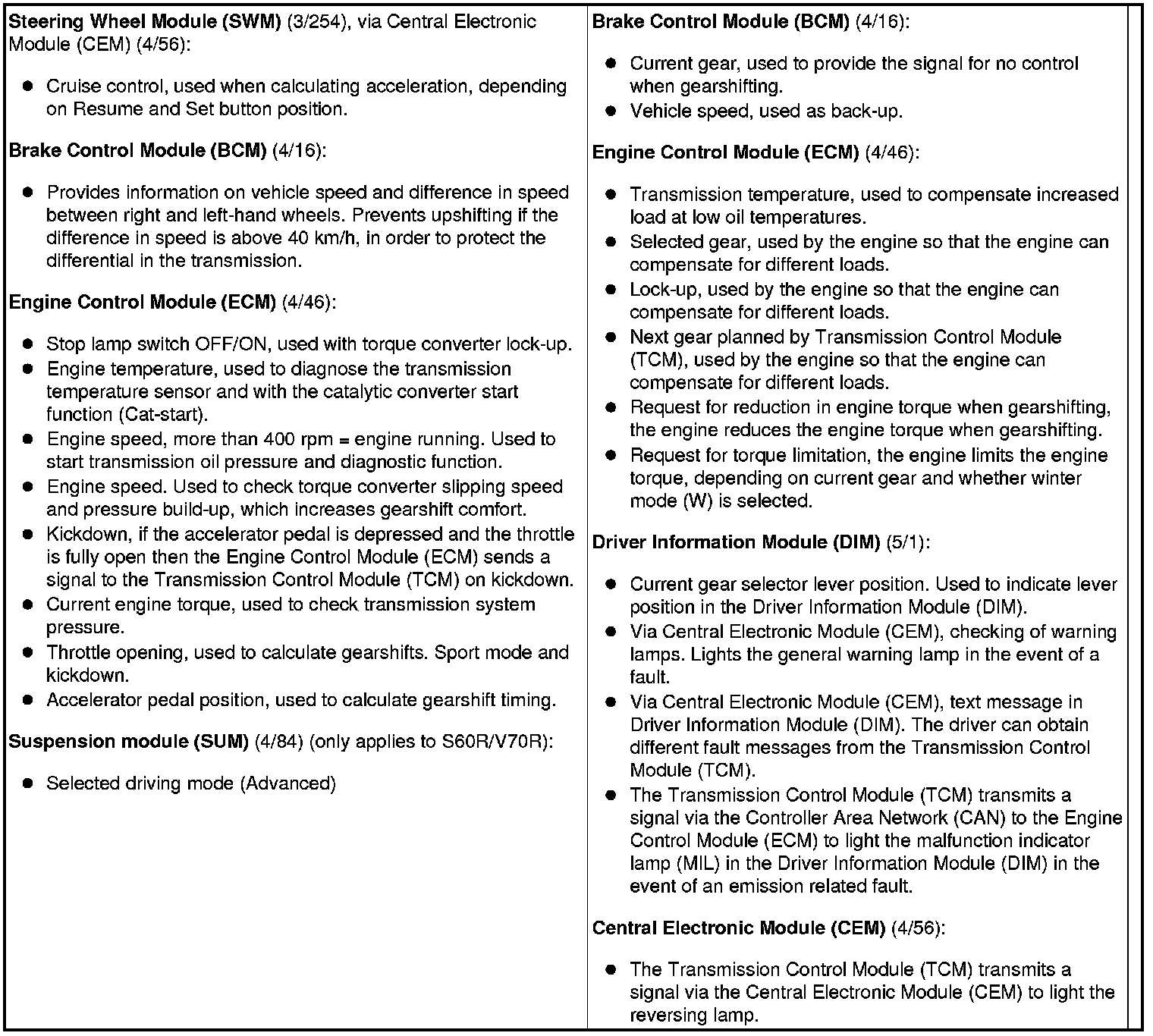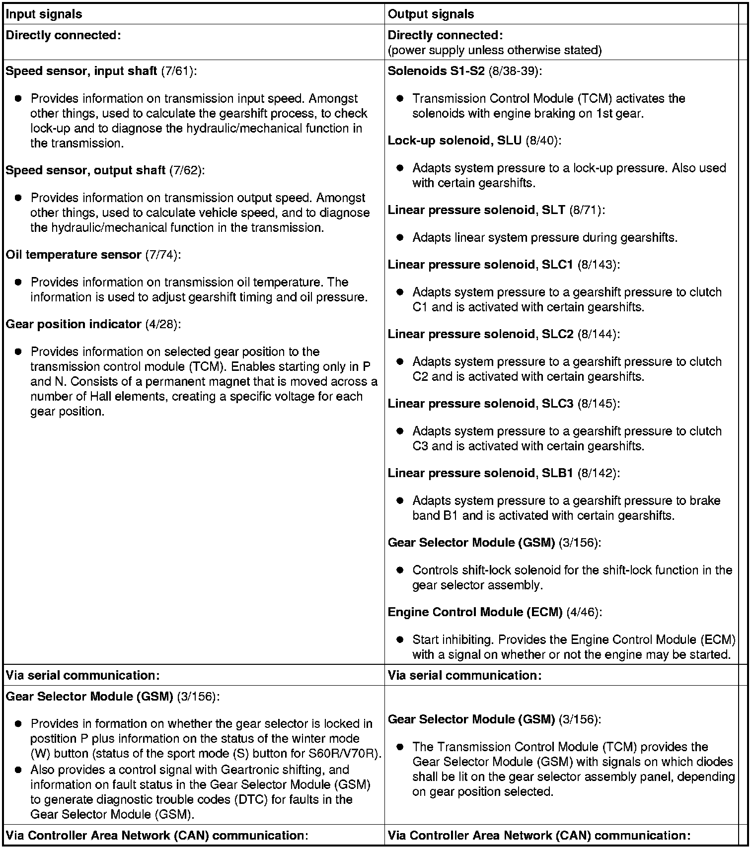 The table below summarizes the input and output signals to and from the Transmission Control Module (TCM). The signal types are divided into directly connected signals, serial communication and Controller Area Network (CAN) communication. The illustration below displays the same information with the Volvo component designations.