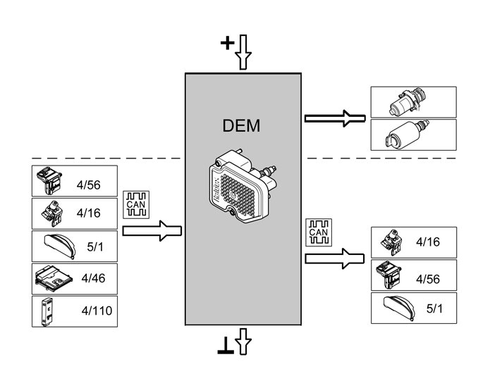 The table below summarizes input and output signals to and from the Differential Electronic Module (DEM). The illustration below displays the same information with the Volvo component designations.