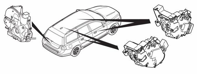 Lock units (6/36, 6/55-57) are installed in doors and tailgate (3/78) (6/8 on XC60 and from model year 2012 also on V70 (08-) and XC70 (08-)). Lock units in doors are directly connected to door modules in each door.