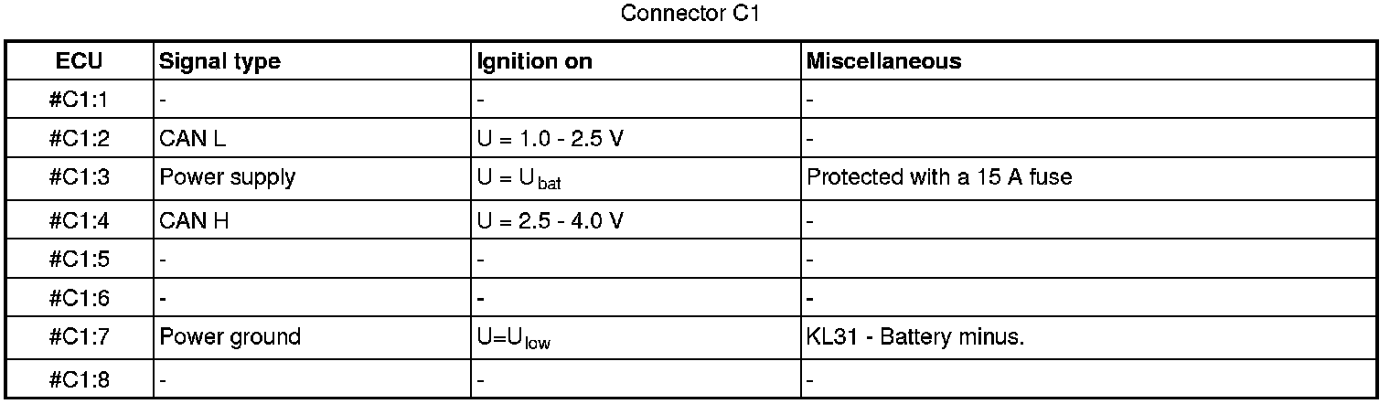 All values that are given for connector C1 are measured between each terminal given in column 1 and #C1:7 (ground terminal).