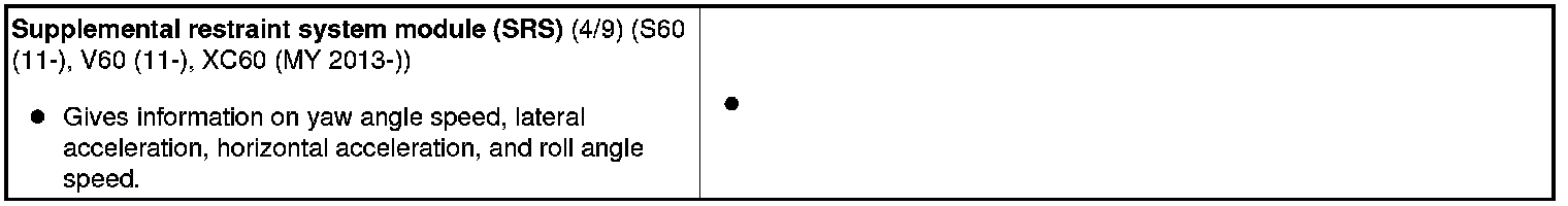 The table below summarizes the input signals to and output signals from the brake control module (BCM). The signal types are divided into directly connected signals, serial communication and CAN communication. The illustration below displays the same information with the Volvo component designations.