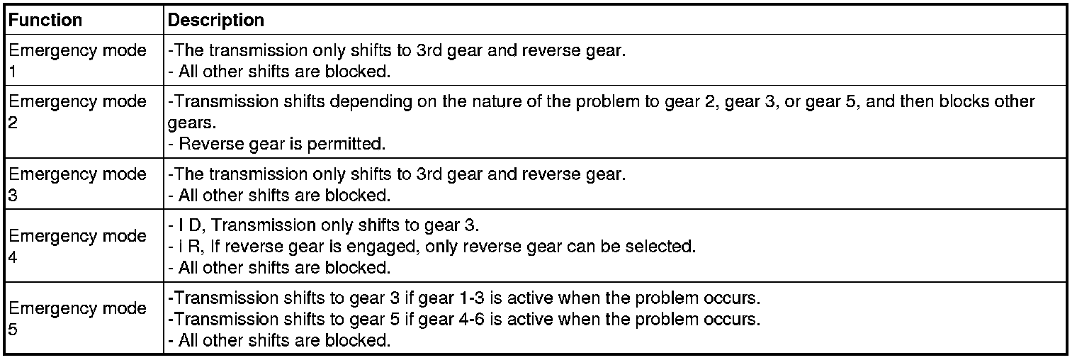The Transmission Control Module (TCM) activates the Emergency mode function in the event of certain malfunctions so that any damage is not made worse, resulting in complete transmission breakdown. The Transmission Control Module (TCM) can activate the function in 5 different stages, depending on the severity of the malfunction.