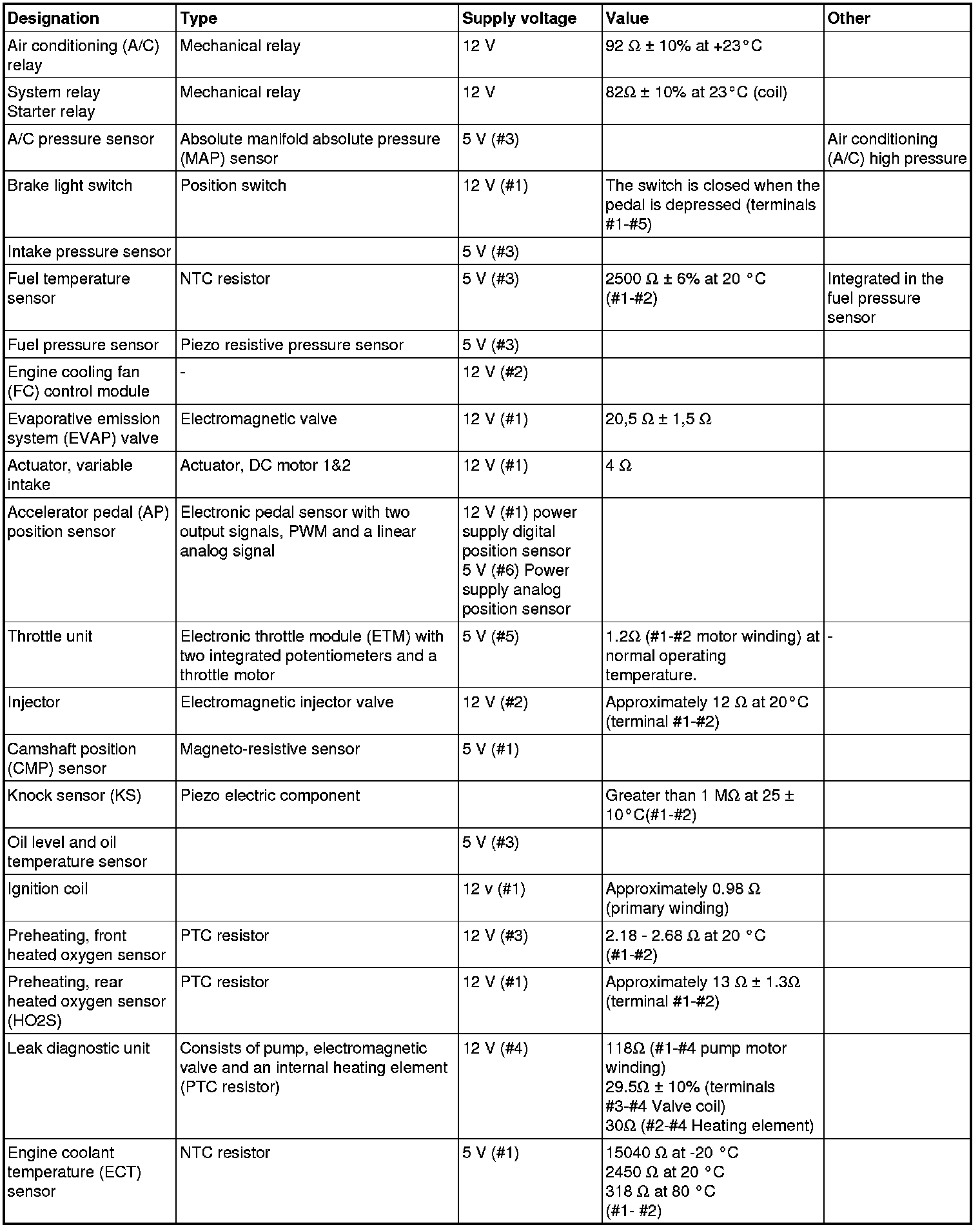 The component specification gives the value of the component when the connector is disconnected. Where no value is given, it is not possible to measure a relevant value at the component.
