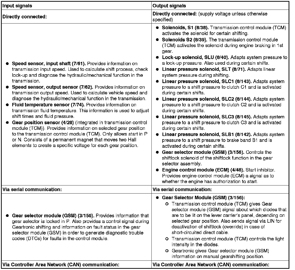 The table below summarizes the input and output signals to and from the transmission control module (TCM). The signal types are divided into directly connected signals, serial communication and CAN communication. The illustration below displays the same information with Volvo component designations.
