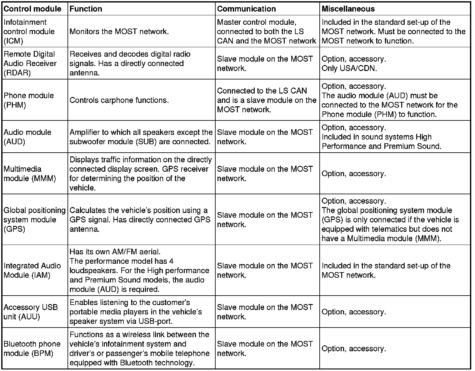 The table below lists all the control modules which may be included in the MOST network.