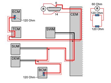 - For LS CAN (low speed), the terminating resistors are located in the upper electronic module (UEM) and the rear electronic module (REM).