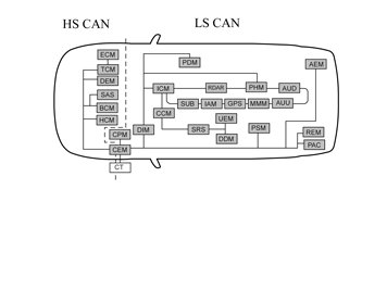 The network consists of two parts: a high speed side (HS CAN) which transmits signals/messages between the central electronic module (CEM) and control modules mainly in the engine compartment, and a low speed side (LS CAN) which transmits signals/messages between the central electronic module (CEM) and control modules in the passenger compartment and the luggage compartment.