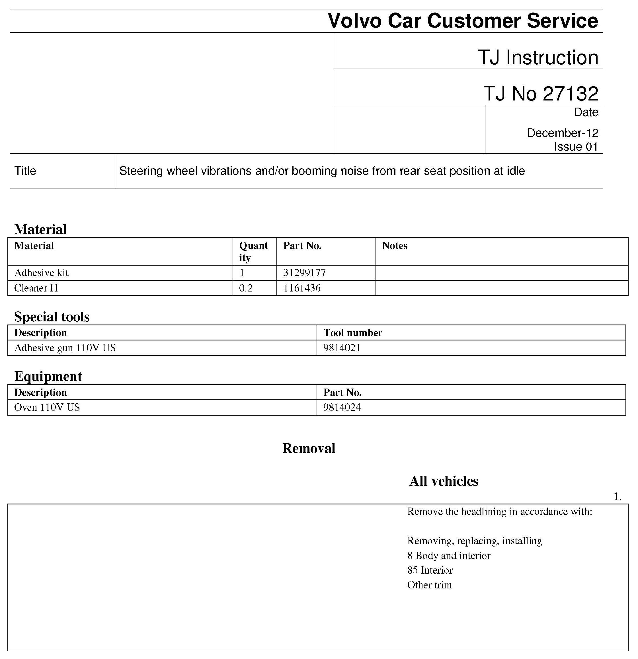An oscillation damper for the steering wheel and new Engine Control Module (ECM) software has been developed to be used as service solution for steering wheel vibrations. For reduction of noise in rear seat, see instruction.