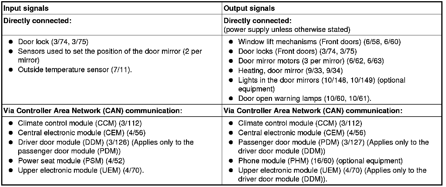 The following table summarizes the input signals to and output signals from the driver door module (DDM) and the passenger door module (PDM). The signal types are divided into directly connected signals and Controller area network (CAN) communication. The following illustration displays the same information with the Volvo component designations.