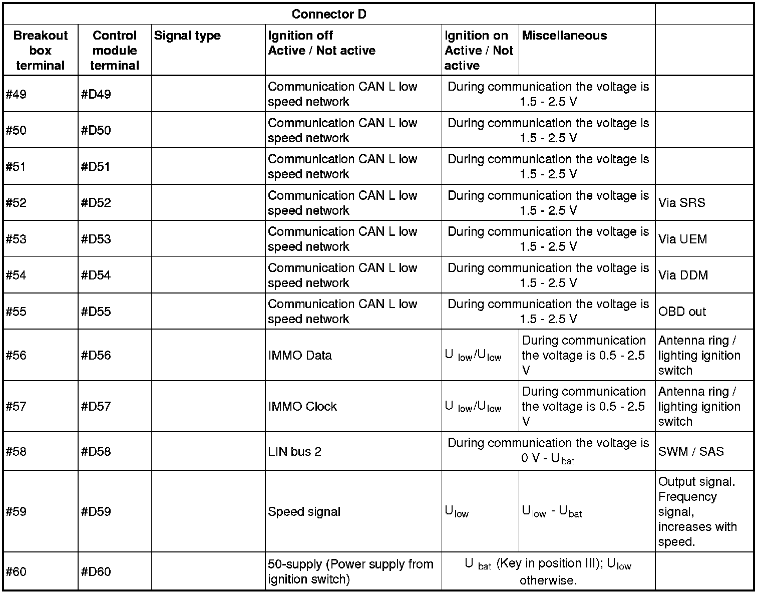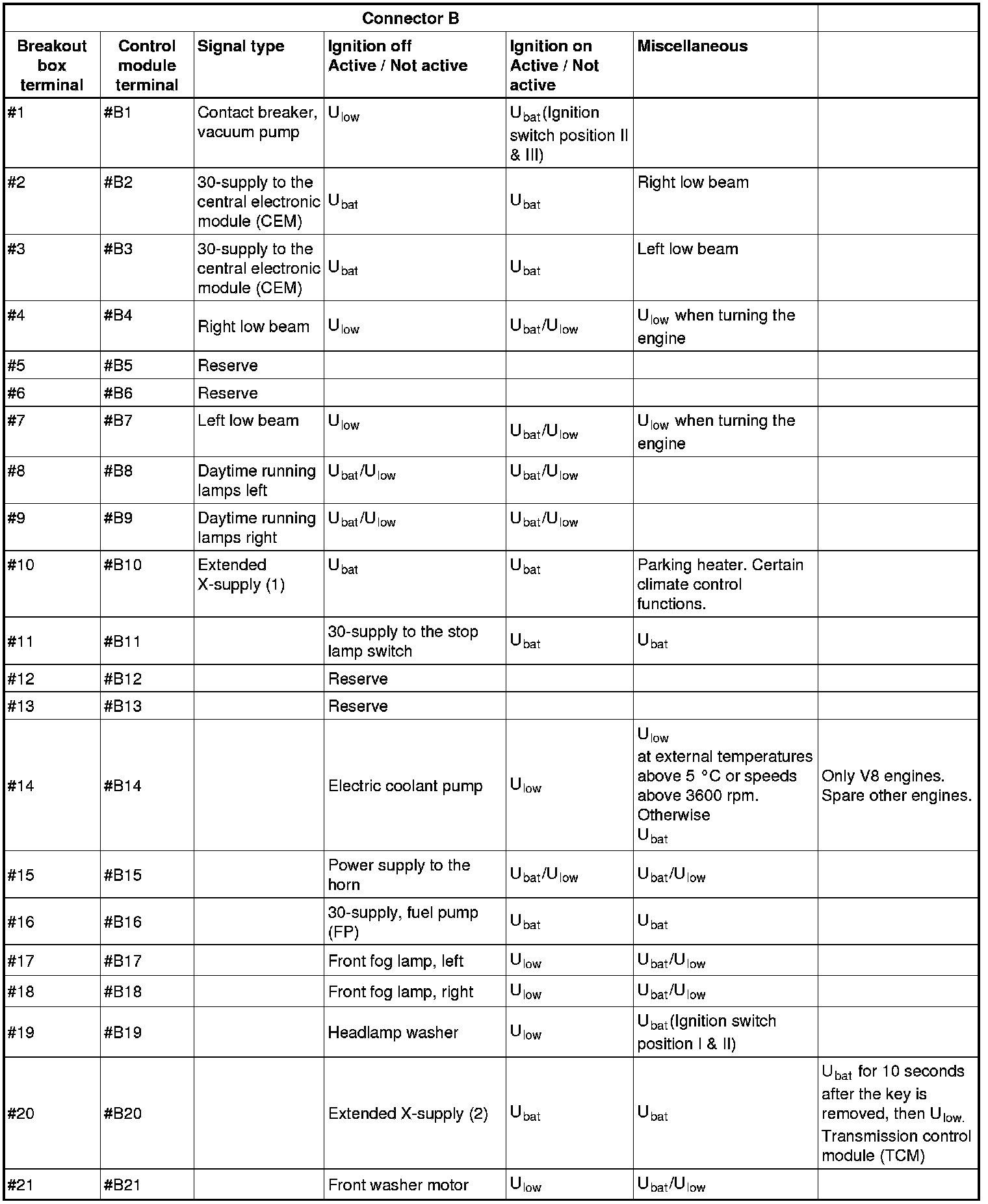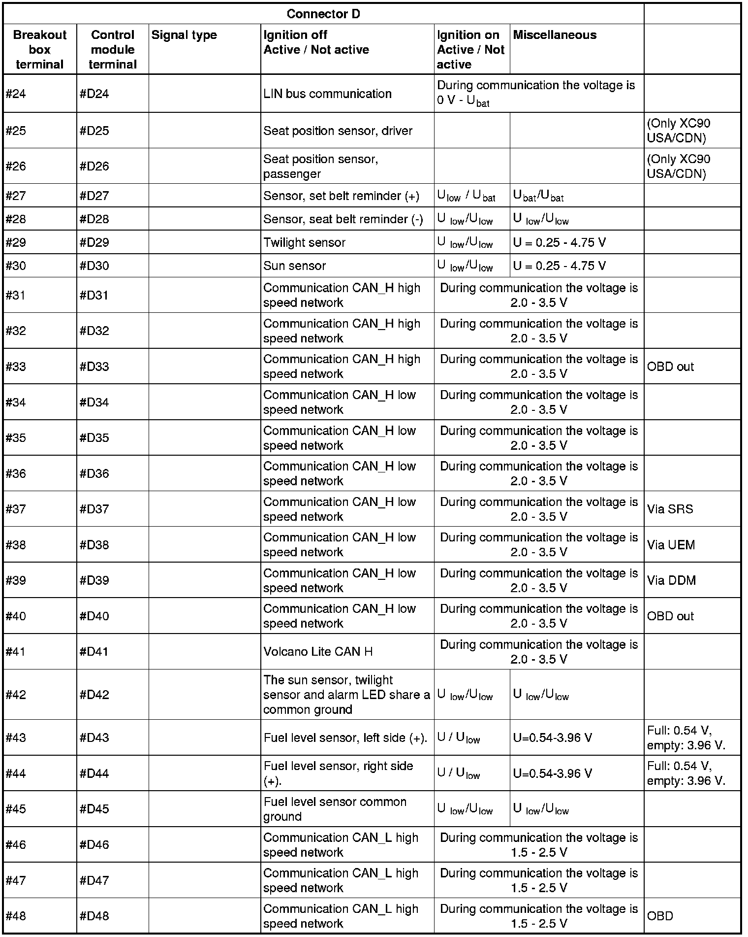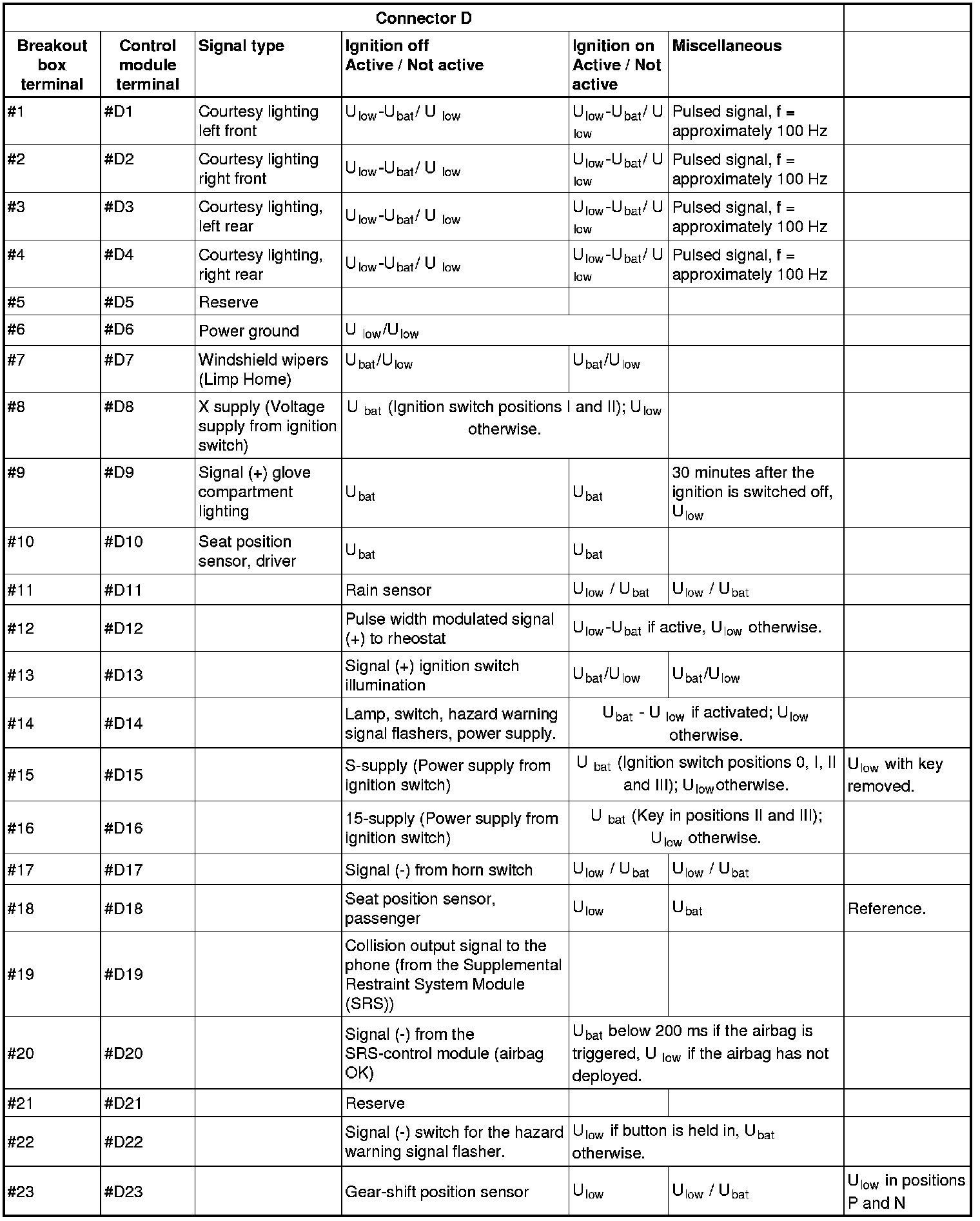 All the values given below are between the terminals stated in column 1 and terminal #D6 in column 2 (power ground). This applies unless otherwise indicated in the last column.